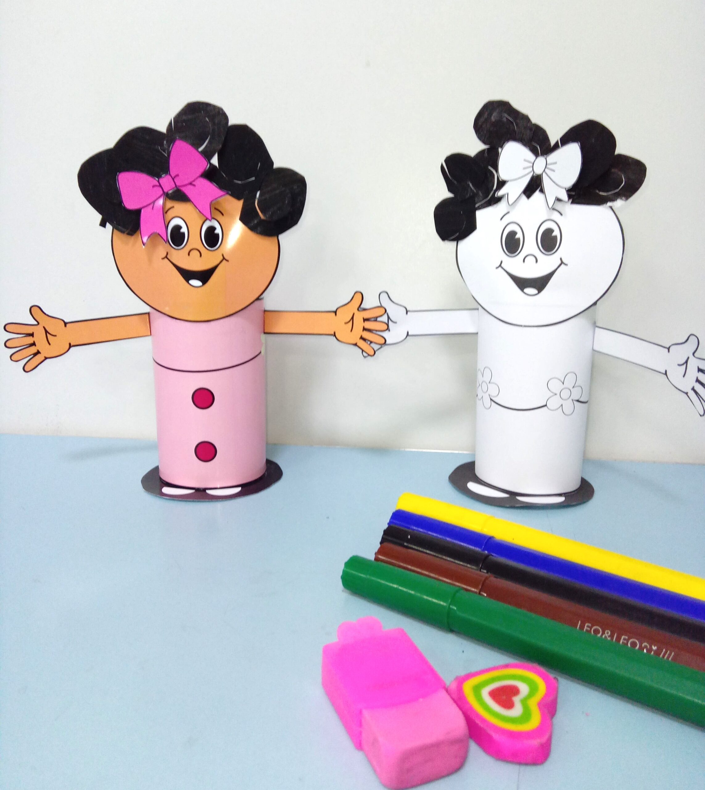 Produzida em papel resistente, ela traz detalhes encantadores, como o cabelo cacheado feito com tiras enroladas, o laço de fita colorido e o sorriso expressivo que transmite alegria e representatividade.