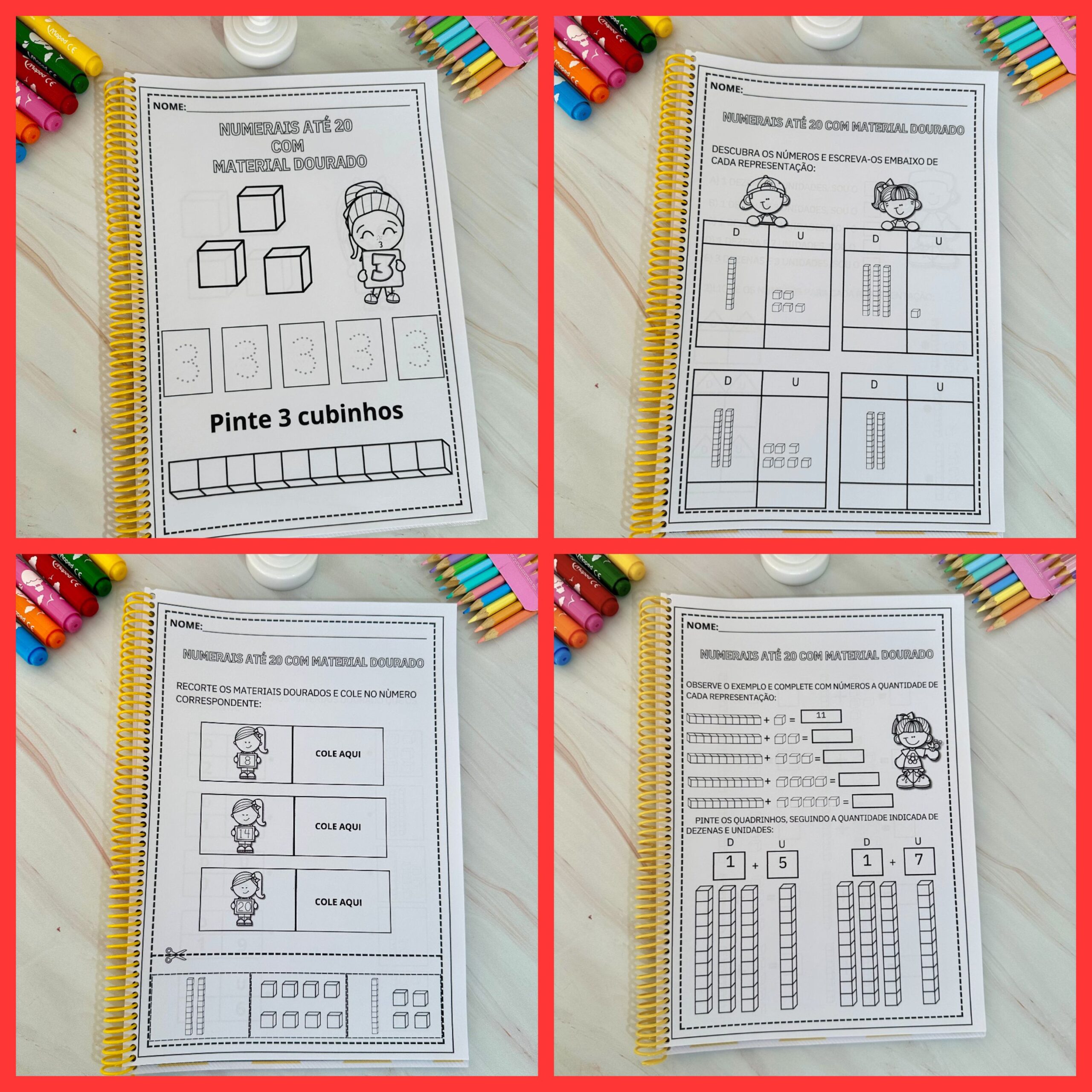 Apostila de atividades para trabalhar os numerais de 1 a 20 com material dourado. O arquivo vai em PDF pronto para impressão, e inclui 30 páginas de atividades para colorir. Proposta excelente para trabalhar numerais com crianças da Educação Infantil e das séries inicias do Ensino Fundamental. Conteúdos abordados: 📍Contagem oral 📍Traçado do números 📍Contagem oral 📍Representação das quantidades 📍Reconhecimento dos números 📍Conceito unidade e dezena 📍Soma 📂 Arquivo em PDF pronto para impressão.