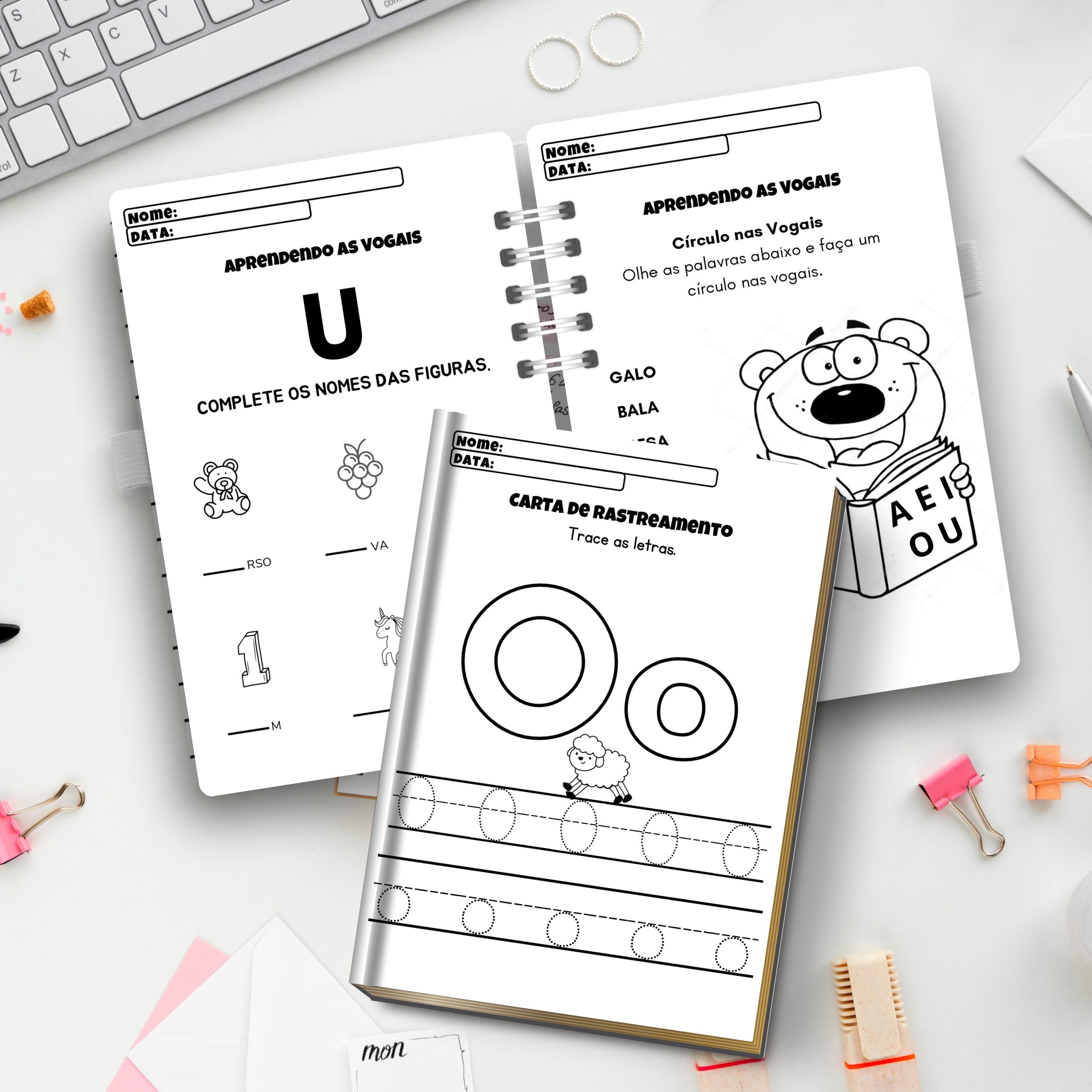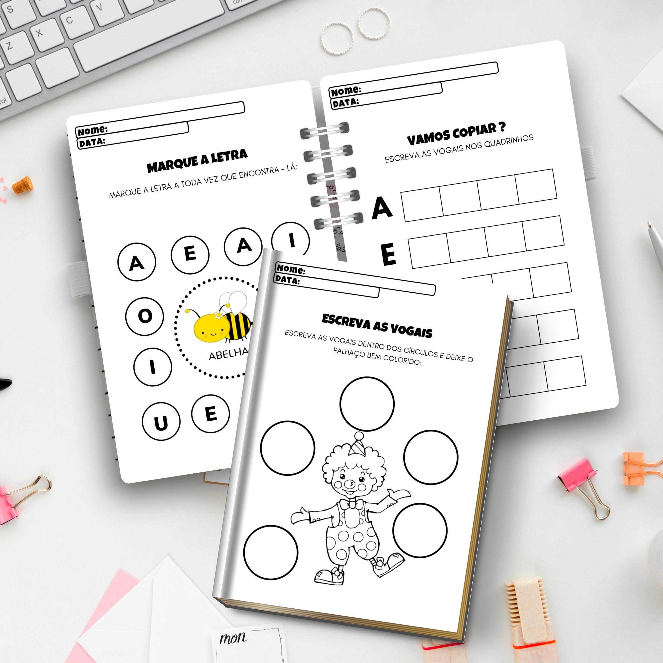 Inclui exercícios como colorir as vogais, completar palavras e traçar letras.