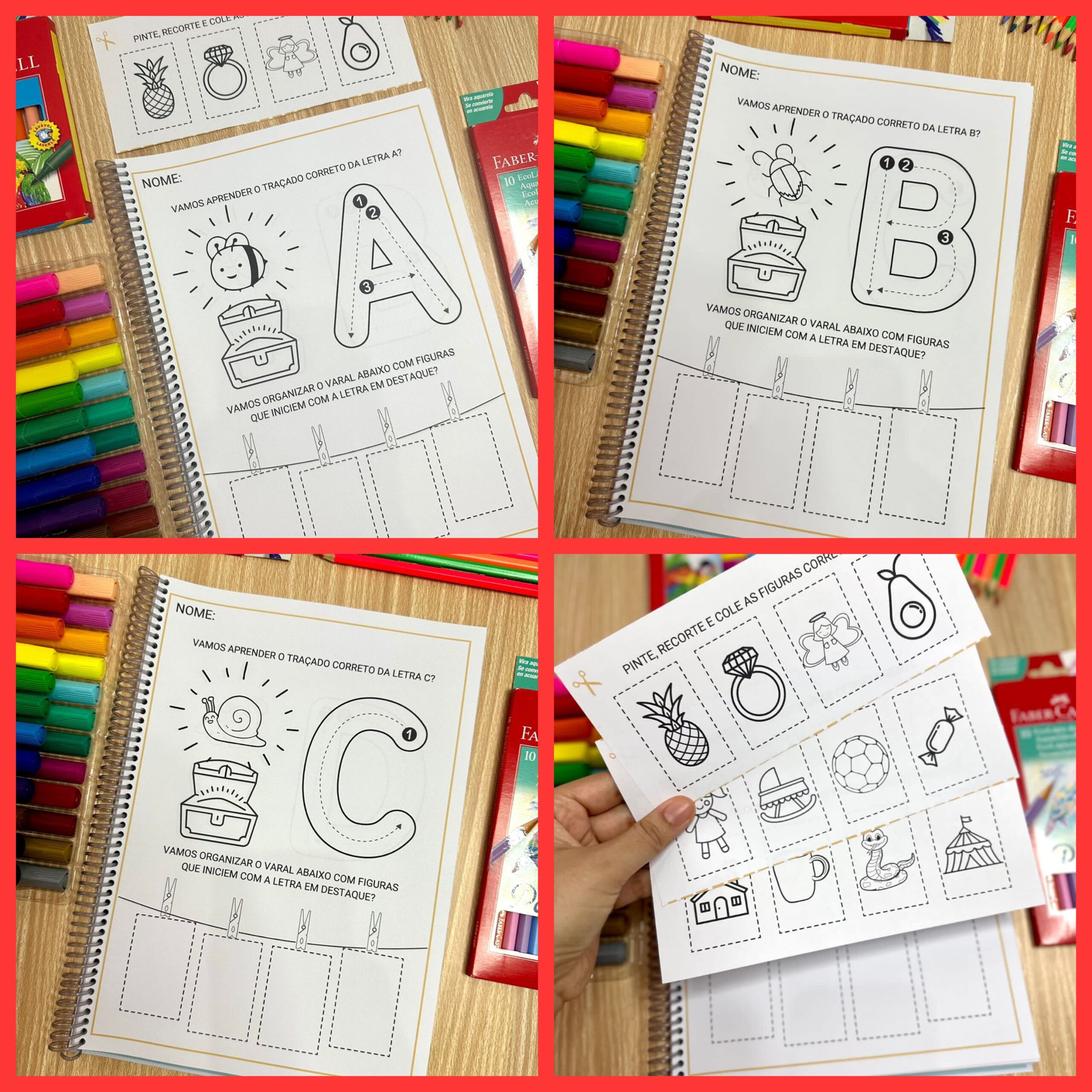 A apostila possui 35 páginas com sugestão de atividades para trabalhar as letras do alfabeto. Inclui atividades para trabalhar todas as letras do alfabeto, as imagens são para colorir, e as atividades abrem possibilidades de diversas mediações em que podemos desenvolver o traçado das letras, seu som e identificação de figuras que iniciam com essa letra. 🗒 Arquivo em PDF. 🖨 Pronto para imprimir.