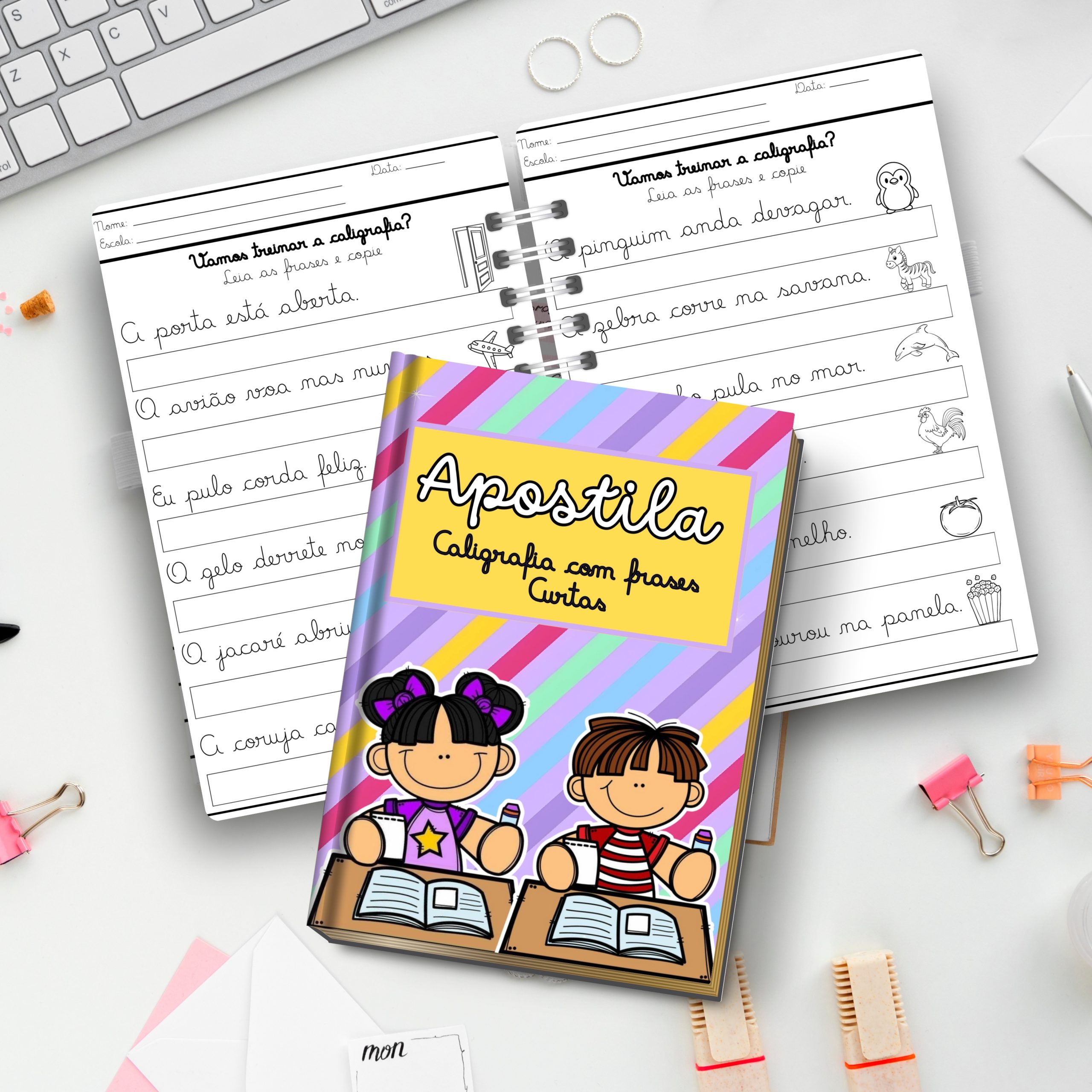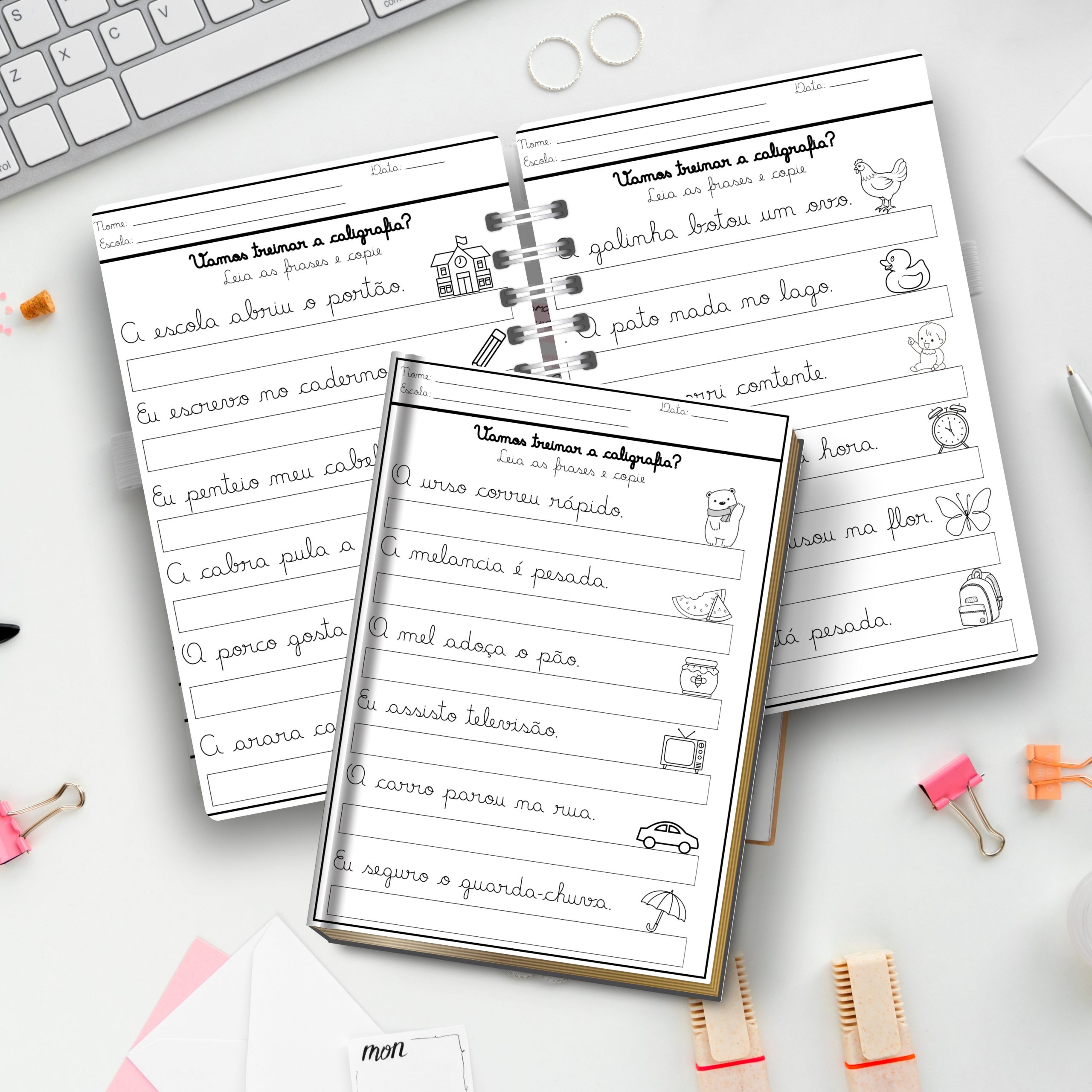 ✏️ Contém diversas frases simples e ilustrativas para copiar, reforçando a leitura, a atenção e a prática da caligrafia.
