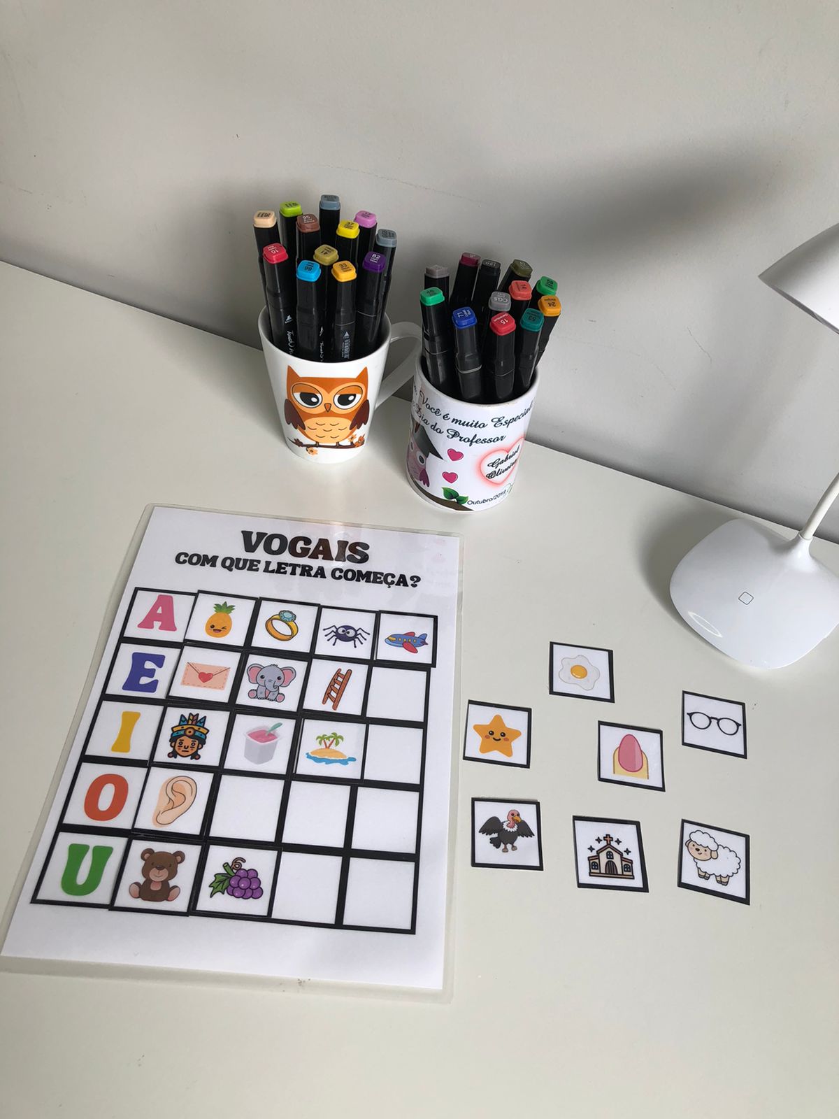 ✨ A criança encaixa os cards com imagens na vogal correta, desenvolvendo a consciência fonológica de forma lúdica.
