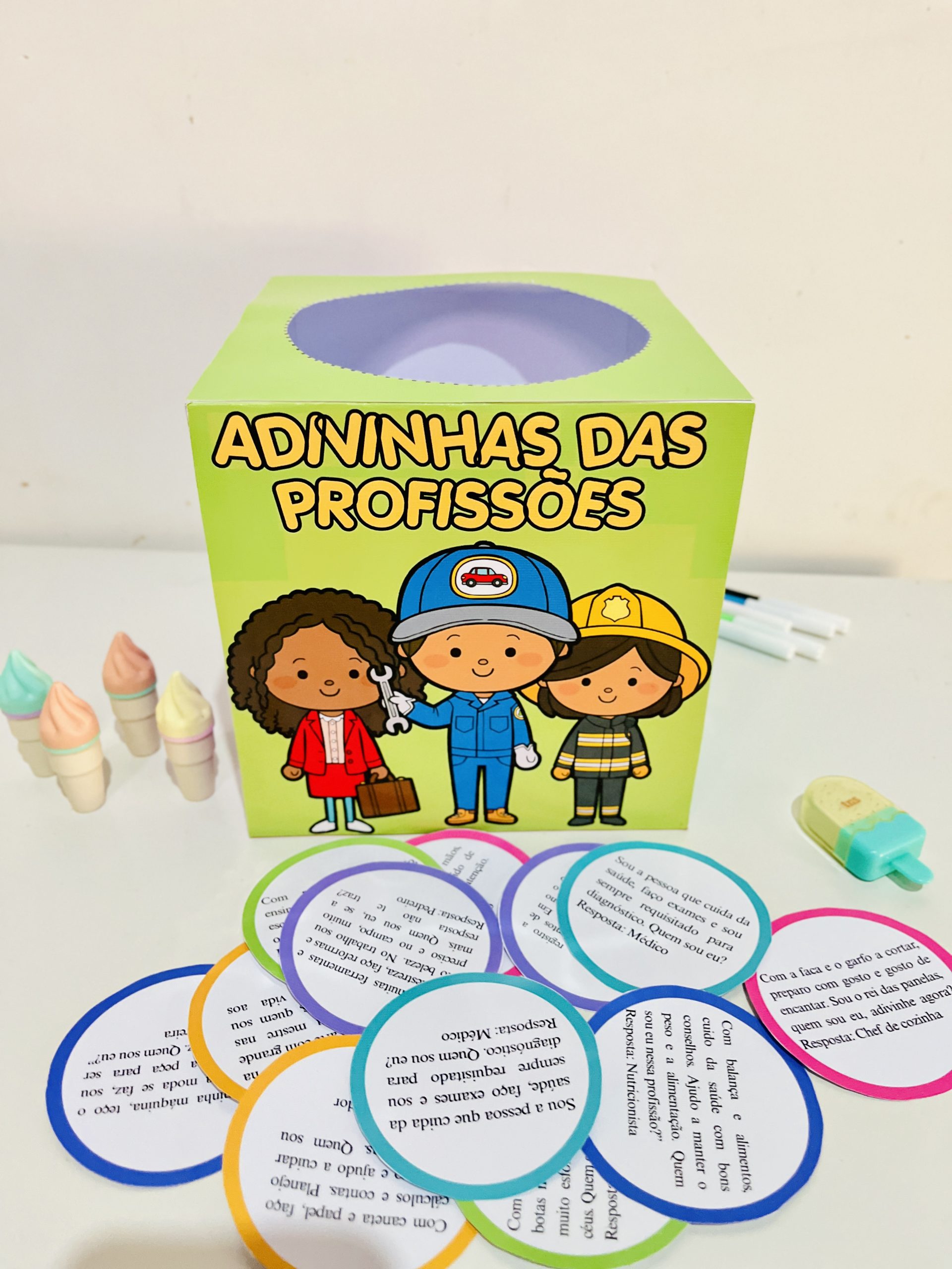 Este arquivo é uma diversão educativa para as crianças, com adivinhas sobre diferentes profissões. Ideal para trabalhar o aprendizado de maneira interativa, cada carta contém uma pista relacionada a uma profissão e, ao final, a resposta. Perfeito para estimular a curiosidade e o conhecimento sobre o mundo profissional de forma lúdica.