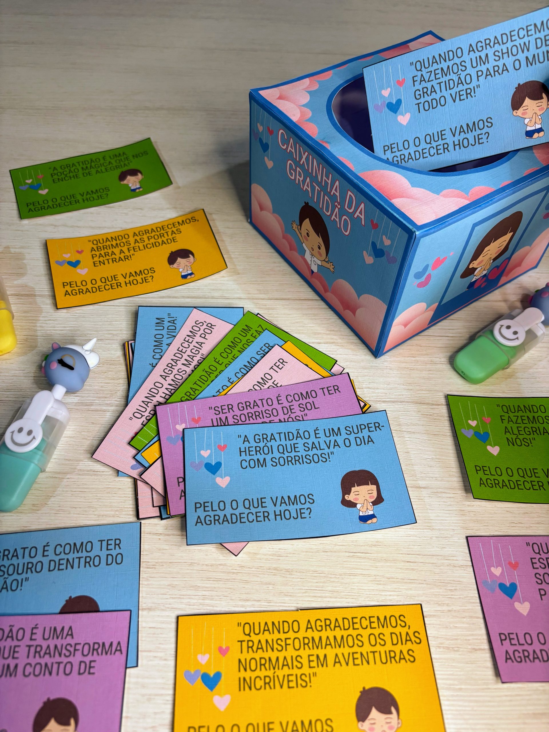 Procurando conexão e aprendizado com seu pequeno em casa? Apresentamos a você a Dinâmica Caixinha da Gratidão 👑 A caixinha da gratidão é um excelente recurso para trabalhar com os pequenos a importância de agradecermos e sermos gratos todos os dias! 🙏💚 A caixinha da gratidão acompanha 30 fichas com 30 frases lúdicas sobre a gratidão para as crianças. Vocês podem fazer a leitura das frases antes de dormir junto com a oração e sempre questionando: Pelo o que iremos agradecer hoje? ✨ Com essa dinâmica, vocês poderão criar um hábito de agradecimento com sua criança todos os dias. Para maior durabilidade, você pode imprimir em papel cartão Crie momentos divertidos com seu pequeno com recursos encantadores e super acessíveis! 💚