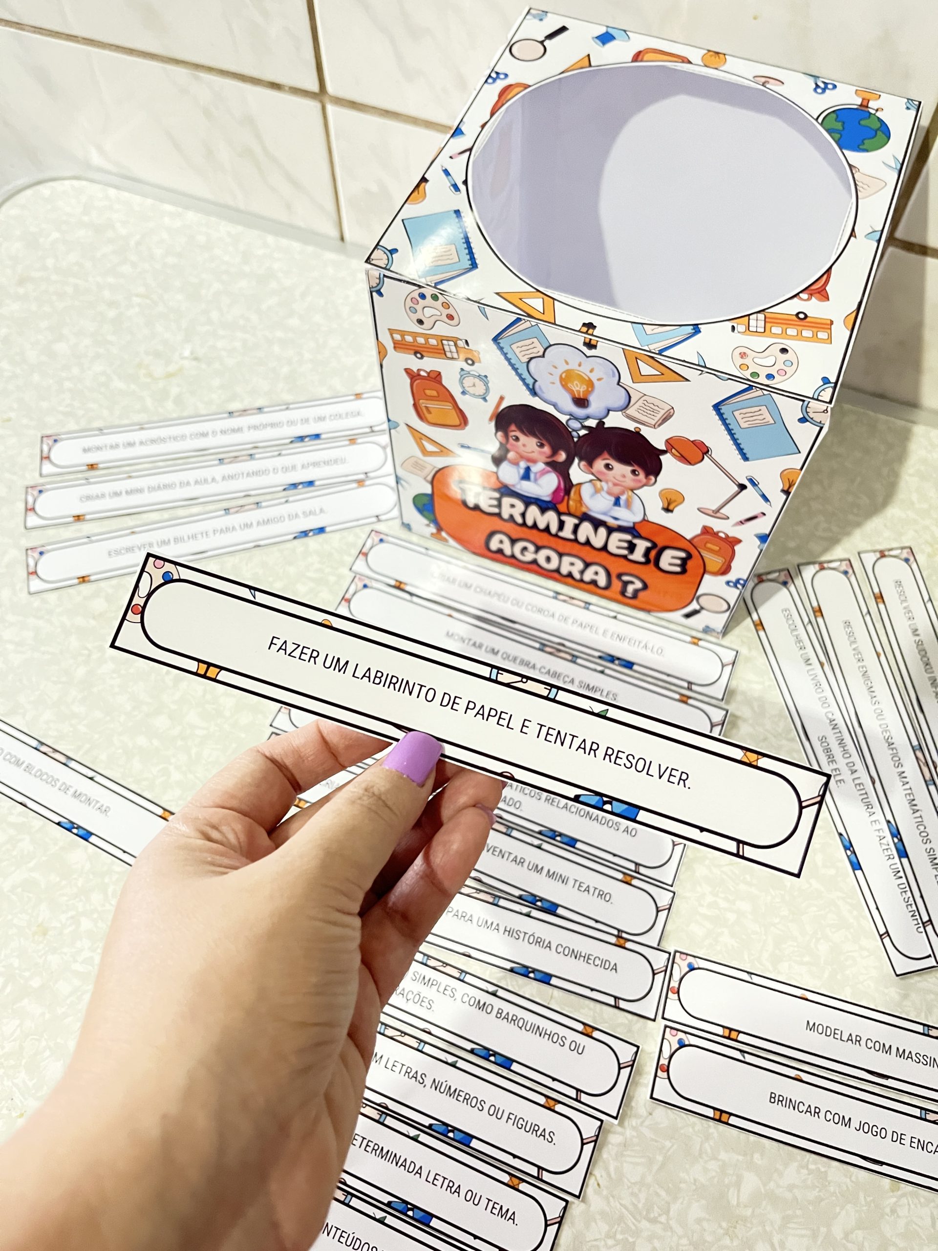 Seus alunos terminam as atividades rápido e ficam sem o que fazer? Com a Caixa “Terminei e Agora?”, eles terão tarefas divertidas e educativas sempre à mão! ✨ O que esse material inclui? ✅ Cartões com desafios criativos e lúdicos. ✅ Atividades que estimulam a autonomia e o aprendizado. ✅ Arquivo pronto para imprimir e usar! 👩🏫 Perfeito para: Professores, escolas, aulas de reforço e educação infantil.