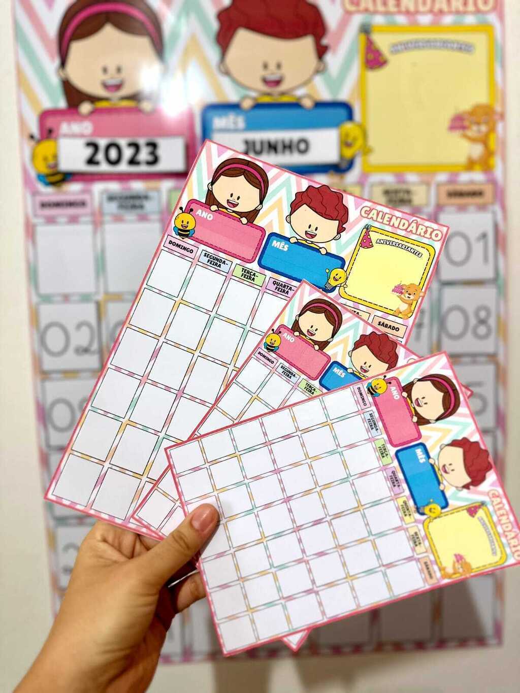 O arquivo acompanha peças móveis para preencher o calendário, e também existe a possibilidade de passar o papel contact no cartaz e preencher manualmente com caneta para quadro branco.