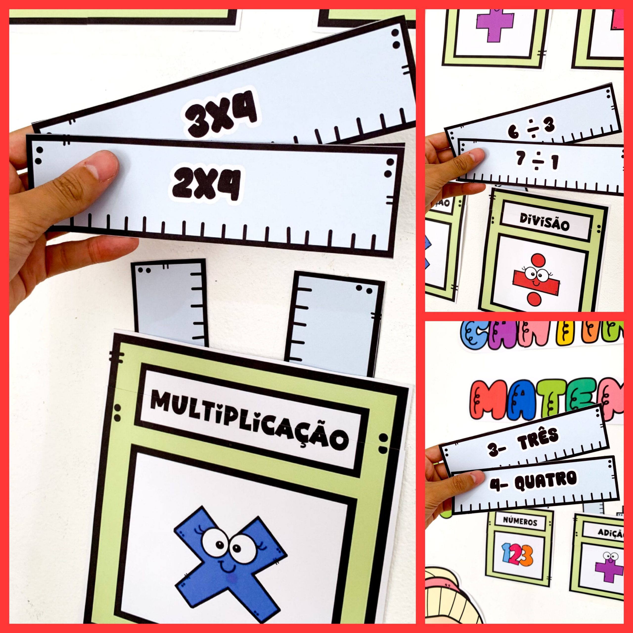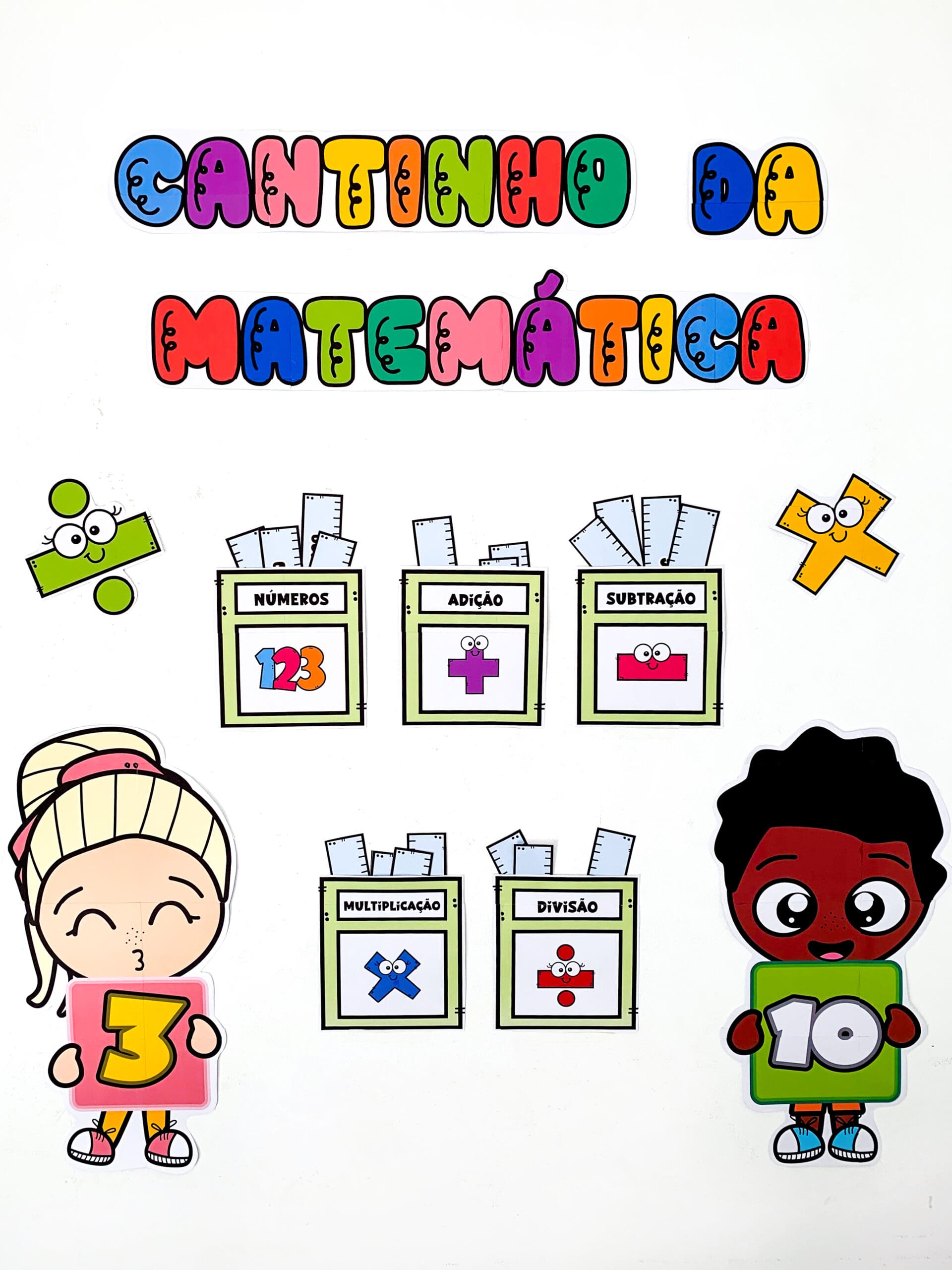 Recurso Cantinho da Matemática para trabalhar o conteúdo com crianças da Educação Infantil e das series iniciais do Ensino Fundamental. Recurso excelente que pode ser utilizado o ano todo com a turma, favorecendo o conhecimento ativo e atrativo. O material vai em PDF pronto para impressão, e inclui os seguintes itens: 📍Painel já ampliado (Aproximadamente 1,5 m de largura e 1,7m de altura montado) 📍Fichas do numerais de 1 a 10 e das dezenas 📍20 fichas de somas 📍20 fichas de subtração 📍20 fichas de divisão 📍20 fichas de subtração