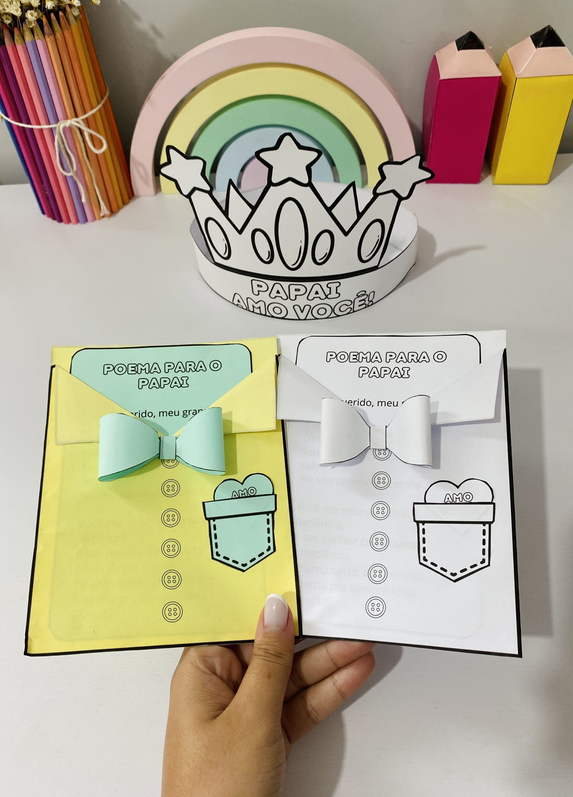 🎁 Cartão Interativo "Poema para o Papai" + Coroa Decorativa 🎉 Uma lembrança cheia de amor e criatividade para o Dia dos Pais! 🧡 O cartão vem em formato de camisa com gravata borboleta e bolsinho em formato de coração. Dentro, um lindo poema que vai emocionar qualquer papai! 👑 Acompanha também uma coroa super fofa com a frase "Papai, amo você!", perfeita para um momento especial de fotos ou homenagens na escola. ✨ Sugestão de uso: Imprima em papel colorido (sulfite ou vergê) para destacar os detalhes e deixar o material ainda mais encantador! A montagem é simples e as crianças vão adorar participar. 📦 Arquivo em PDF para imprimir e montar. Ideal para lembrancinha escolar, atividades em família ou como mimo personalizado.