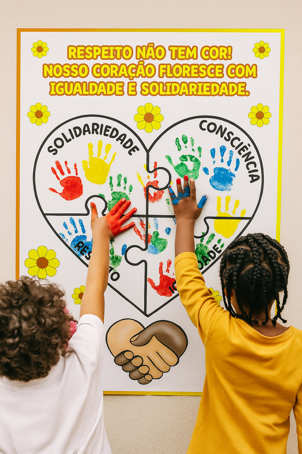 ✨✊🏿 Painel Consciência Negra ✊🏽✨ Celebre o Dia da Consciência Negra de forma lúdica e significativa com este painel colaborativo! Cada criança pode carimbar sua mãozinha colorida, formando um mural cheio de vida que simboliza respeito, igualdade, diversidade e união entre culturas. 🌈🤲🏿🤲🏾🤲🏽 📌 Detalhes do produto: ✔ Tamanho: 0,76 x 1,08 m ✔ Arquivo em PDF (16 folhas A4) ✔ Fácil de imprimir e montar ✔ Perfeito para escolas, projetos pedagógicos e atividades de conscientização 💡 Uma maneira criativa de trabalhar com os alunos valores como representatividade, empatia e valorização da cultura afro-brasileira.