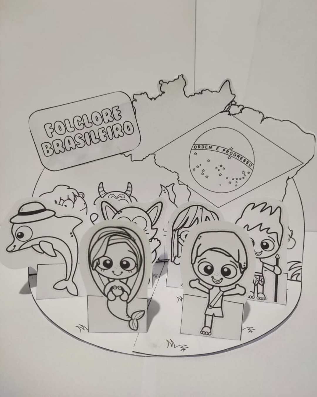Nosso arquivo PDF traz todos os personagens do folclore em duas folhas prontas para colorir e montar em 3D.