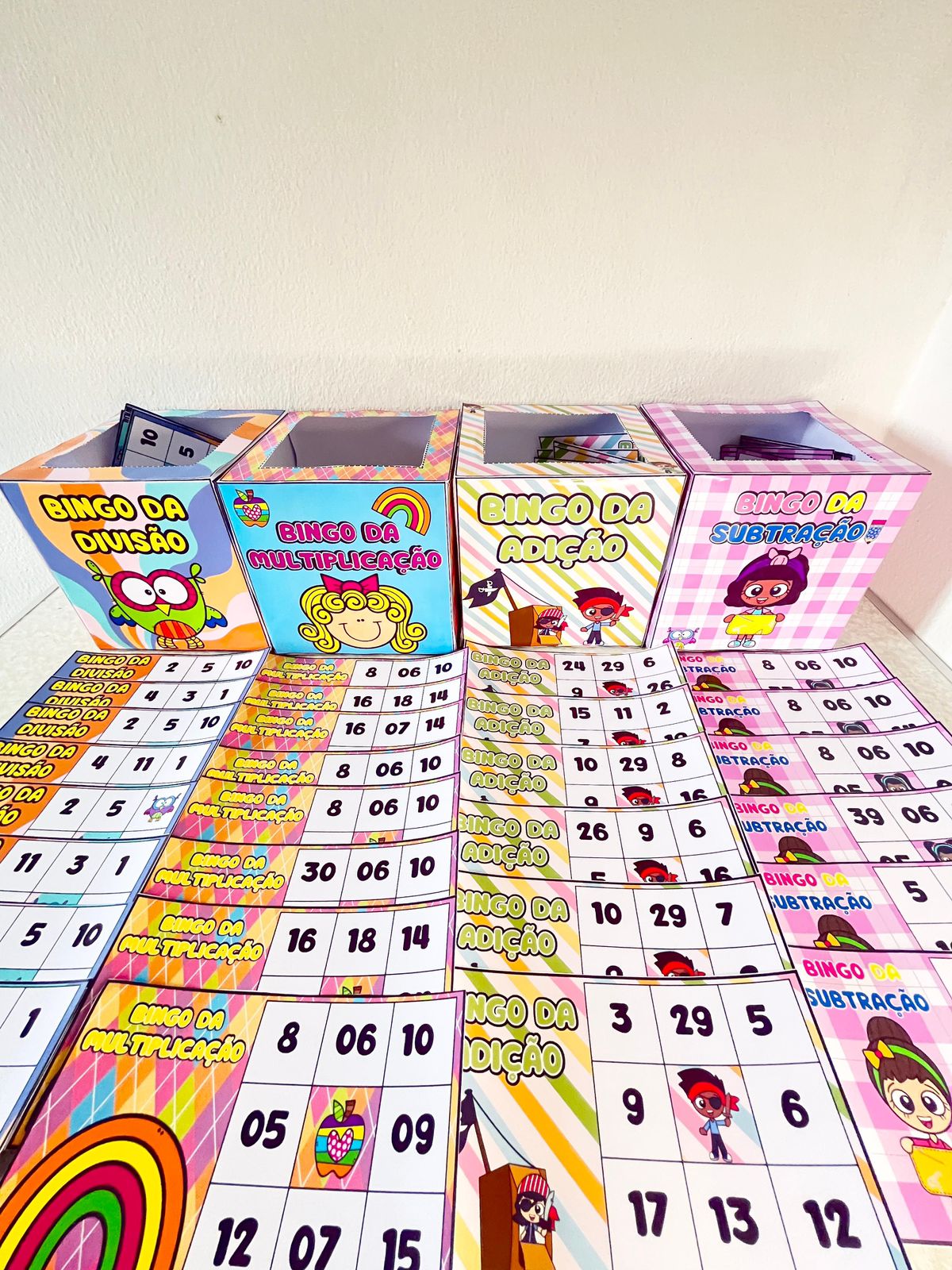 *SUPER COMBO BINGOS MATEMÁTICOS* 🎉➕➖✖️➗ Aprender matemática nunca foi tão divertido! Quatro bingos incríveis para trabalhar adição, subtração, multiplicação e divisão de forma lúdica e dinâmica com as crianças! Cada bingo contém: • Fichas variadas • Cards para sorteio • Caixa inclusa • Arquivo em PDF colorido e pronto para imprimir! Inclui: ➕ *Bingo da Adição* (16 fichas | 32 cards | 25 págs) ➖ *Bingo da Subtração* (32 fichas | 32 cards | 26 págs) ✖️ *Bingo da Multiplicação* (30 fichas | 32 cards | 25 págs) ➗ *Bingo da Divisão* (28 fichas | 19 cards | 23 págs) Perfeito para sala de aula, reforço escolar ou brincar aprendendo em casa! *Garanta já o seu combo e transforme a matemática em diversão!*
