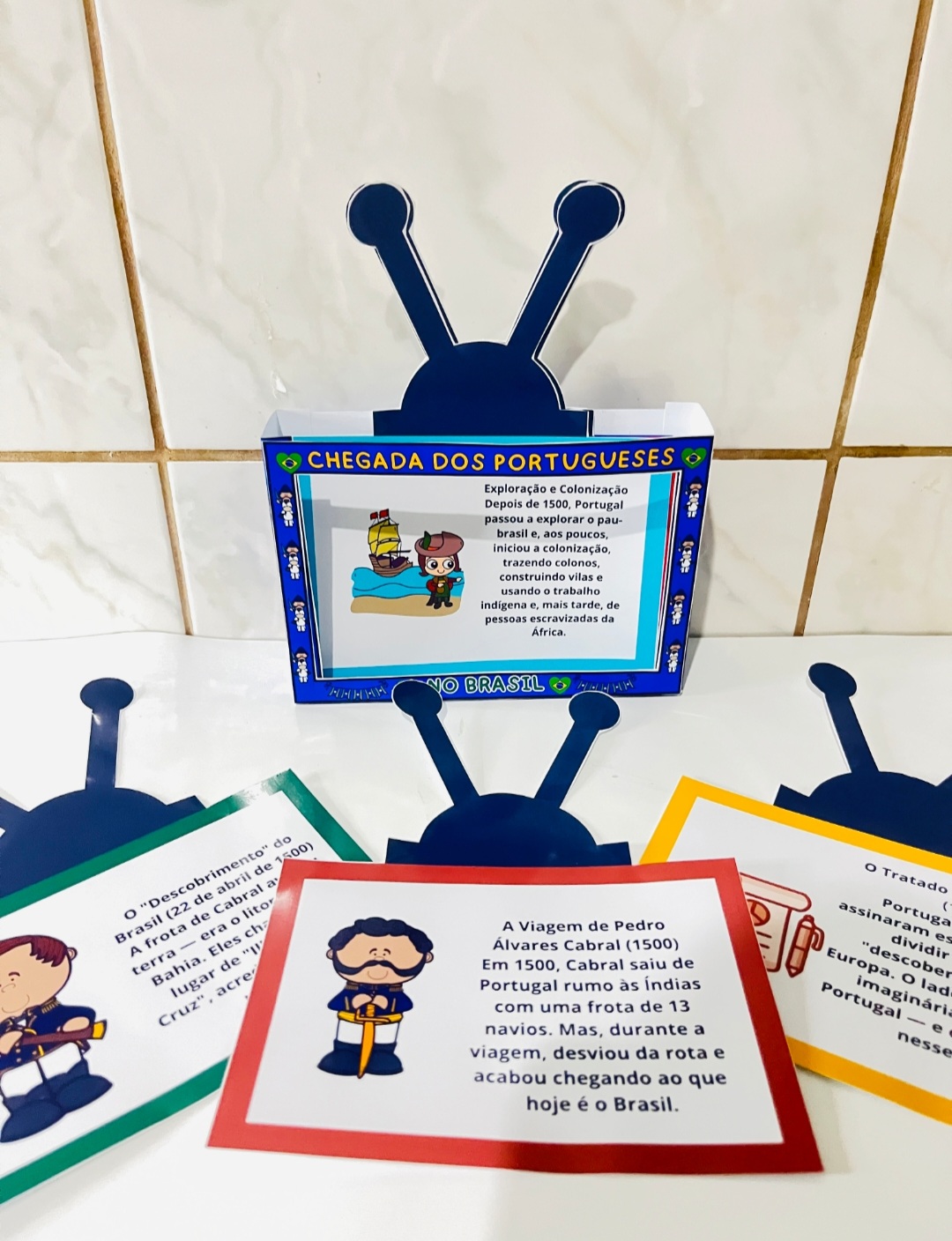 “A História Gira na Tela” – A Chegada dos Portugueses ao Brasil como você nunca viu! Transforme a sua sala de aula em um cinema da história com nossa TV Interativa dos Descobrimentos! Dentro da caixinha mágica, você encontra cards em forma de TV que revelam, cena a cena, as 6 etapas da chegada dos portugueses ao Brasil! Cada card é uma "transmissão histórica", com linguagem acessível e momentos marcantes que ajudam as crianças a visualizar, entender e se encantar com essa parte tão importante do nosso passado. O que vem na caixa? 📍1 molde de caixa em papel cartonado para montar 📍6 cards molde TV ilustrados, um para cada etapa: 🔹️As Grandes Navegações 🔹️ Tratado de Tordesilhas 🔹️A Viagem de Cabral 🔹️ O Descobrimento 🔹️ O Contato com os Povos Indígenas 🔹️ Início da Colonização 🔹️ Ideal para trabalhar história de forma lúdica, visual e participativa com os slunos do ensino fundamental!