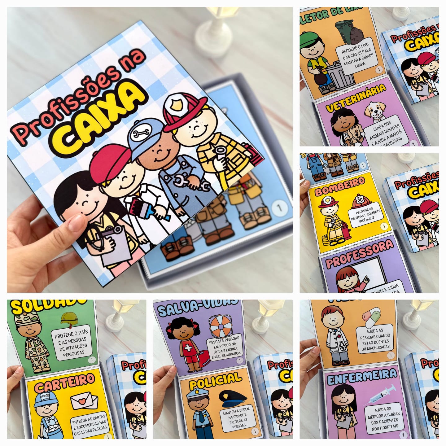 Livro Profissões na Caixa para trabalhar o tema com crianças da Educação Infantil. Esse recurso inclui diversas profissõesilustradas edescriçõesde como essesprofissionais contribuem para a sociedade.