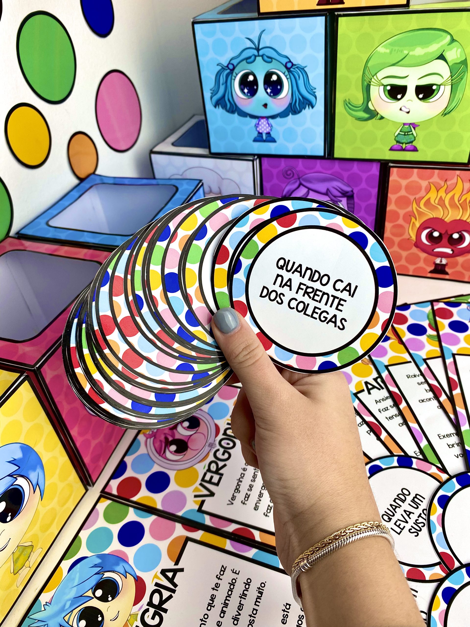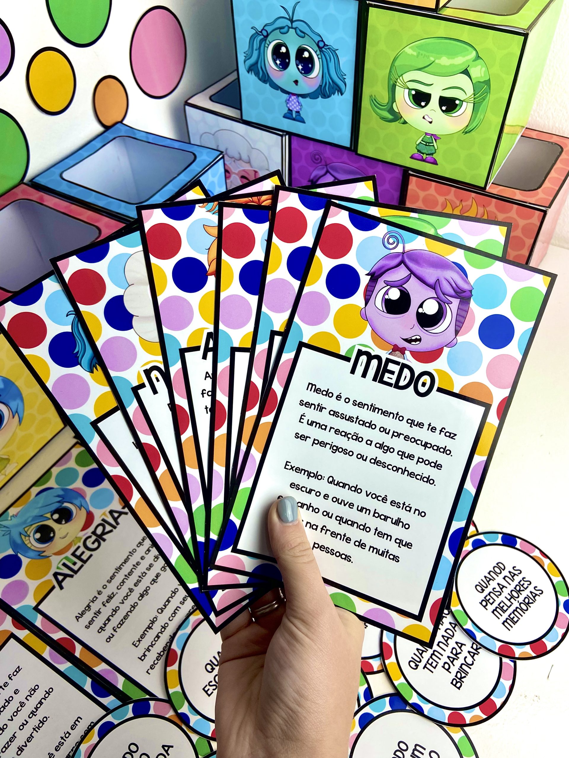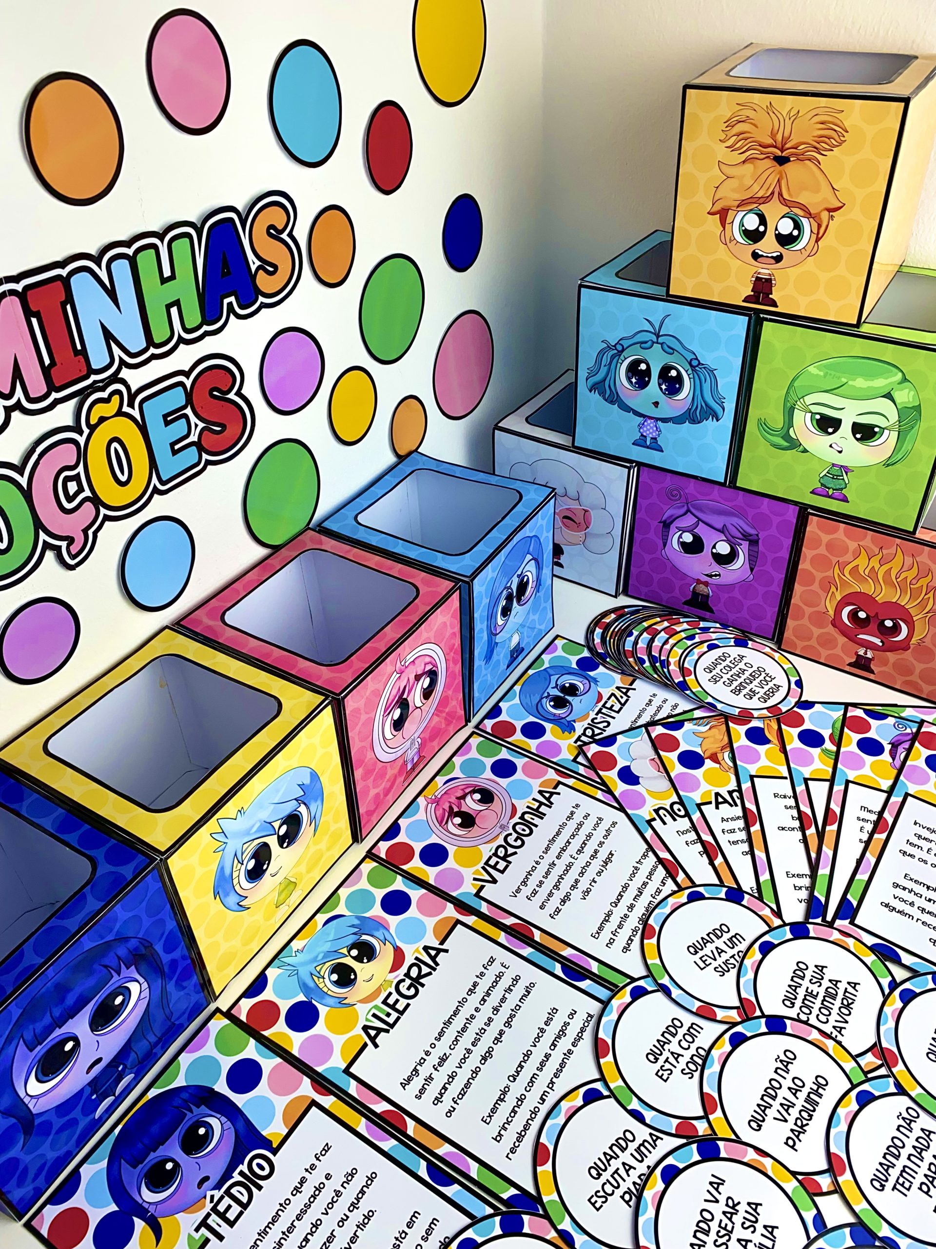 Dinâmica para trabalhar as emoções com a temática do filme Divertidamente. Este material trabalha as seguintes emoções: Alegria, Raiva, Tristeza, Inveja, Tédio, Vergonha, Nostalgia, Medo, Ansiedade e Nojinho. Nesta dinâmica o professor deve ler as fichas para cada aluno e perguntar em qual caixinha ele quer deixar essa ficha, referente à emoção dela. Este material contém: 🌟10 caixinhas de cada emoção. 🌟42 fichas de situações 🌟10 fichas explicando cada emoção 🌟Painel decorativo “Eu e Minhas Emoções” Clique aqui⤵