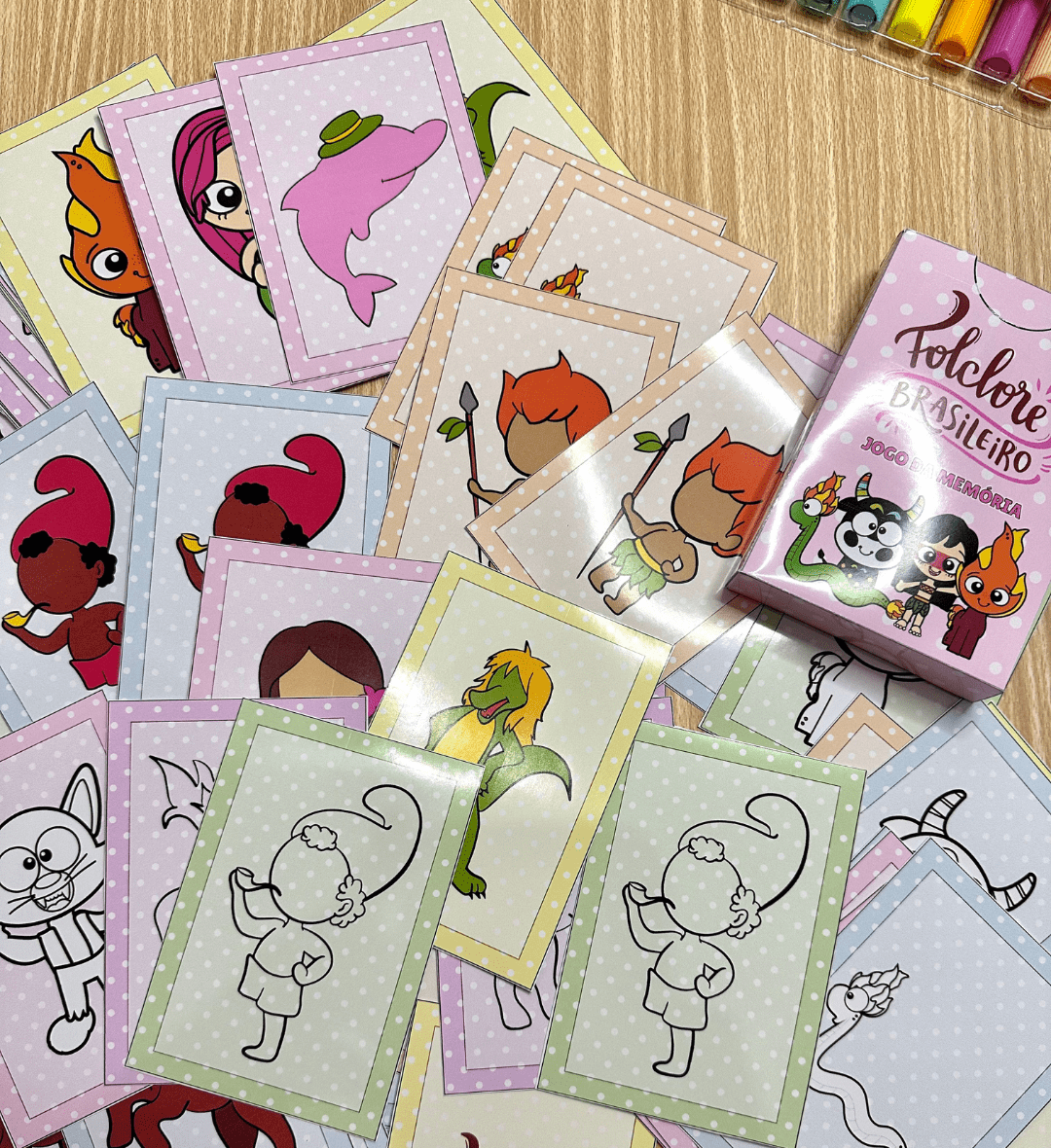 O arquivo Jogo da Memória Folclore acompanha 32 fichas diferentes, e uma caixinha para guardar o material.
