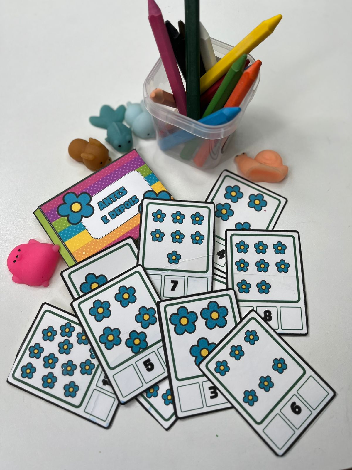 O Antes e Depois é um jogo de cartas com números e quantidades em que a criança observa, pensa e escreve o antecessor e o sucessor do número sorteado. Um recurso perfeito para fixar a ordem numérica de forma prática e significativa.