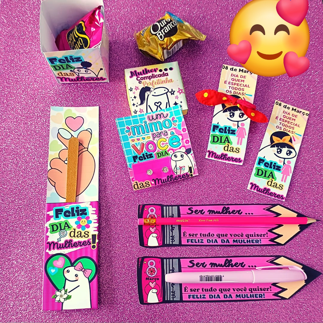 Lindo kit para comemorar o Dia das mulheres de uma maneira muito especial. Você receberá; 💜Painel "Feliz Dia das Mulheres" imagens 💜Lembrancinhas: - tag lápis/caneta/marca-texto; - tag lixa de unha/gloss; - caixinha para bombom/balinhas/esmalte; - tag para "xuxinha" (amarrador de cabelo); - tag para brinco. 💜Atividades. 🖨 Arquivo em PDF pronto para a impressão.