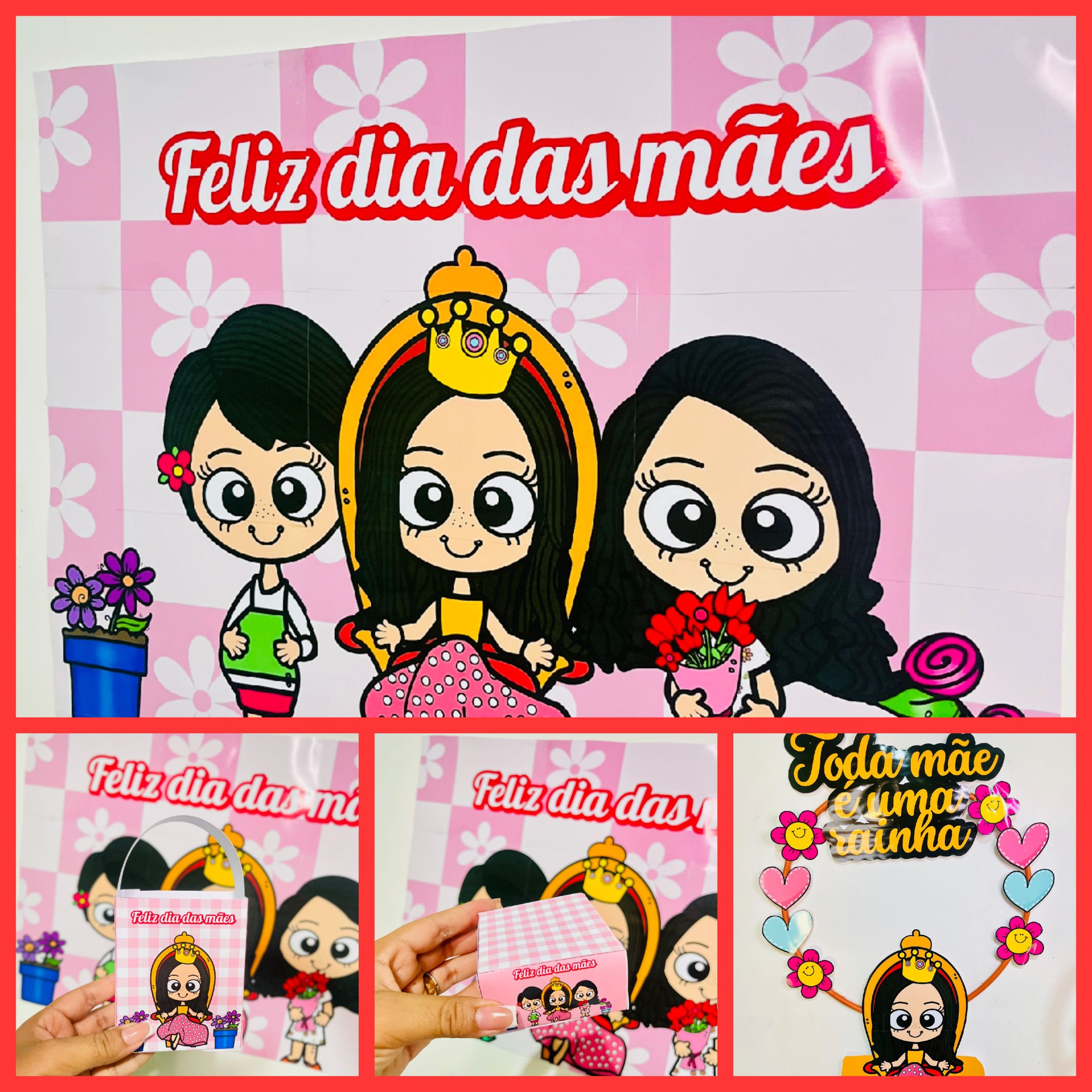 Este kit possui um painel encantador para o Dia das Mães traz um design divertido e acolhedor, com a frase “Feliz Dia das Mães” e personagens adoráveis com coroas, flores e muito mais!