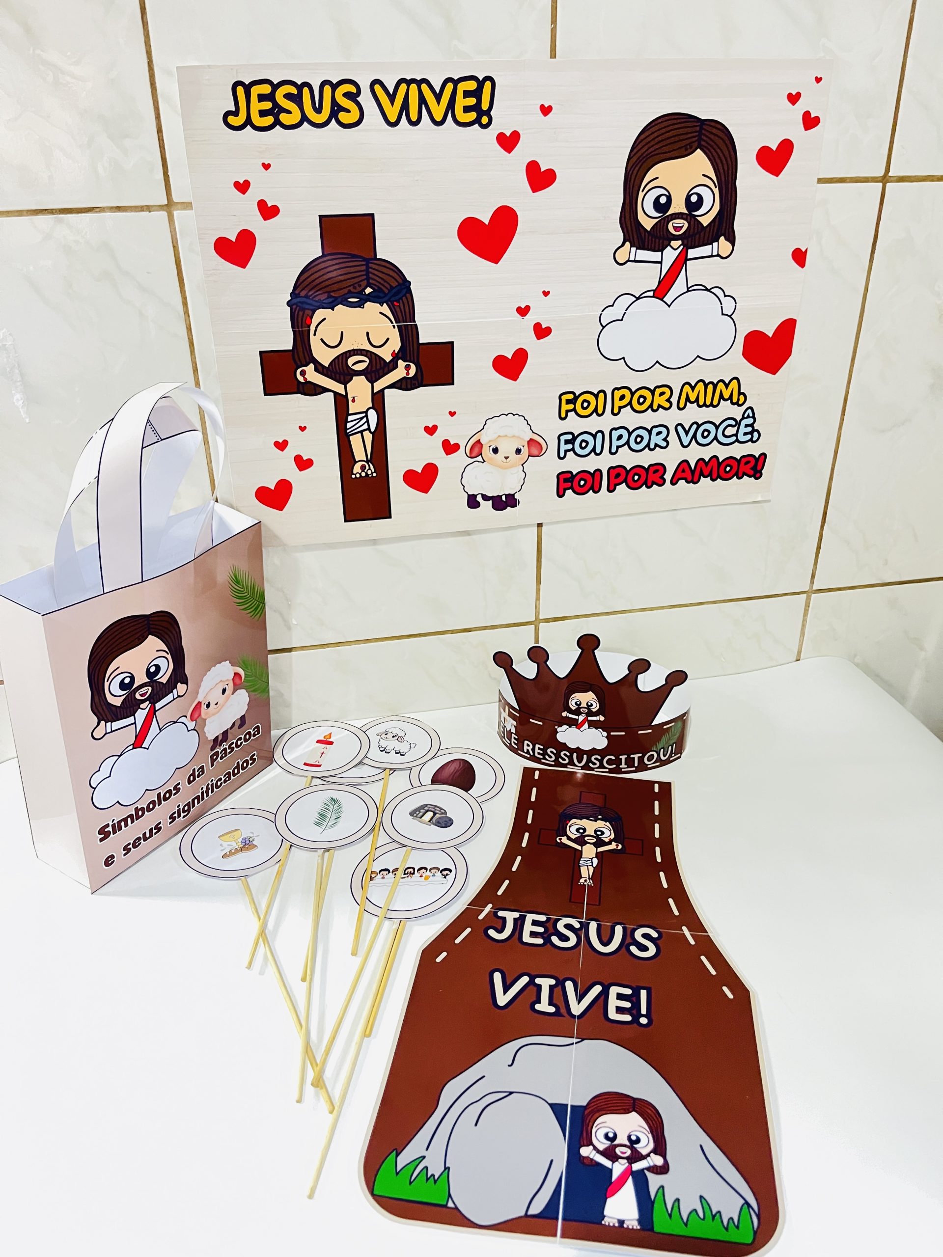 Celebre a verdadeira mensagem da Páscoa com um kit completo, criativo e cheio de fé! 💛🙌 O QUE VEM NO KIT: ✝️ Avental “Jesus Vive” – Lindo, temático e funcional! Perfeito para contar histórias e encantar as crianças enquanto transmite a mensagem da salvação. 🌿 Painel Decorativo – Transforme seu espaço com uma decoração significativa e inspiradora! 👑 Coroa para fotos – Para os pequenos se sentirem parte da história! Um toque lúdico e cheio de simbolismo. 👜 Sacola teatral com símbolos da Páscoa – Traga a mensagem da cruz, do pão, do peixe e da ressurreição de forma visual e interativa. Uma verdadeira aula viva sobre o verdadeiro significado da Páscoa! 💬 Transmita fé de forma criativa, emocionante e inesquecível!