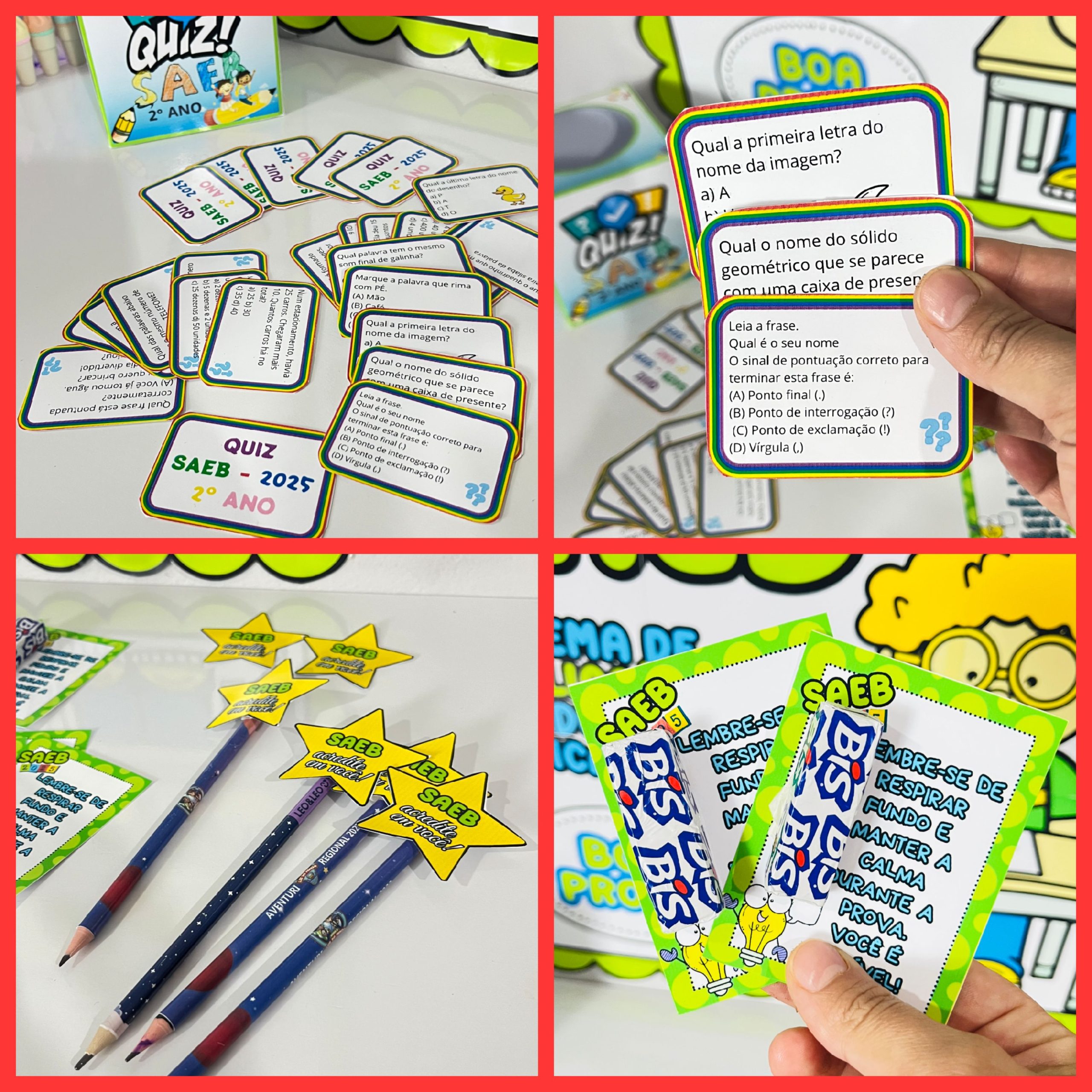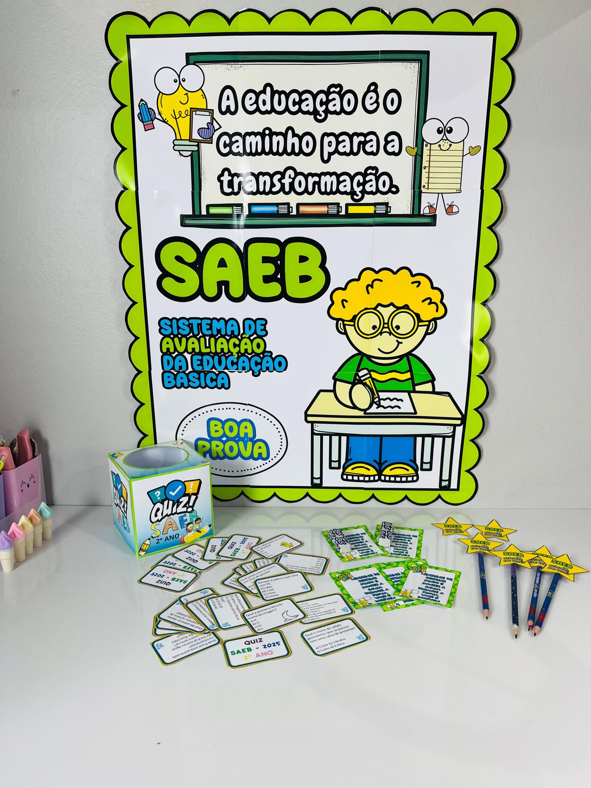 💫Transforme a preparação para o SAEB em um momento leve, divertido e cheio de motivação! Nosso Kit SAEB foi criado para engajar os alunos, incentivar a autoconfiança e deixar a sala de aula ainda mais acolhedora na hora das provas. 📦 O que você encontra no kit: ✅ Cartaz colorido ampliado ✅ +De 90 Cartas de quiz lúdicas para revisar os conteúdos de português e matemática ✅ Card lembrancinha ✅ Ponteira de Lápis personalizada