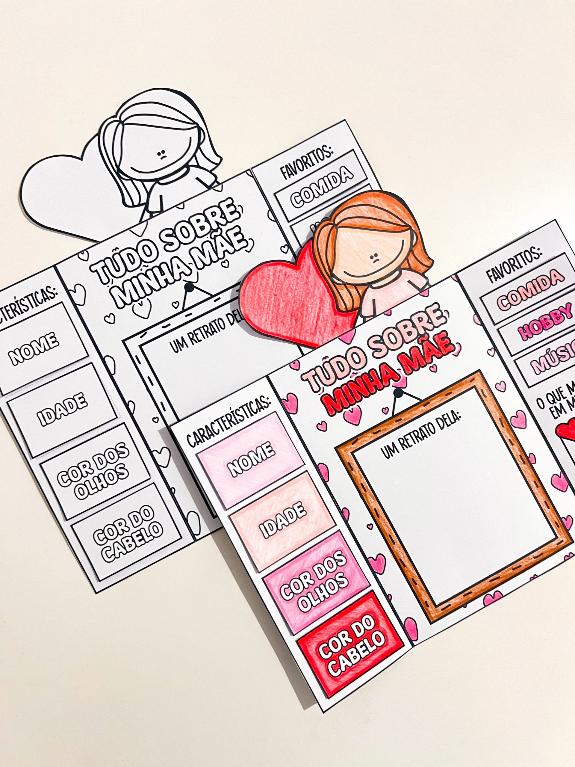 Esse material pedagógico é um lapbook para o Dia das Mães, feito especialmente para crianças pequenas, como as do Ensino Fundamental I. Ele tem o objetivo de homenagear as mães de forma carinhos e personalizada, promovendo a expressão de sentimentos e o desenvolvimento da escrita. O lapbook está dividido em seções simples e lúdicas, onde a criança pode preencher informações sobre sua mãe: 📍Características: nome, idade, cor dos olhos e cor do cabelo; 📍Favoritos da mamãe: comida, hobby e música; 📍O que mais gosto em minha mãe: espaço para a criança expressar seu carinho; 📍Um retrato dela: espaço para desenhar a mãe.