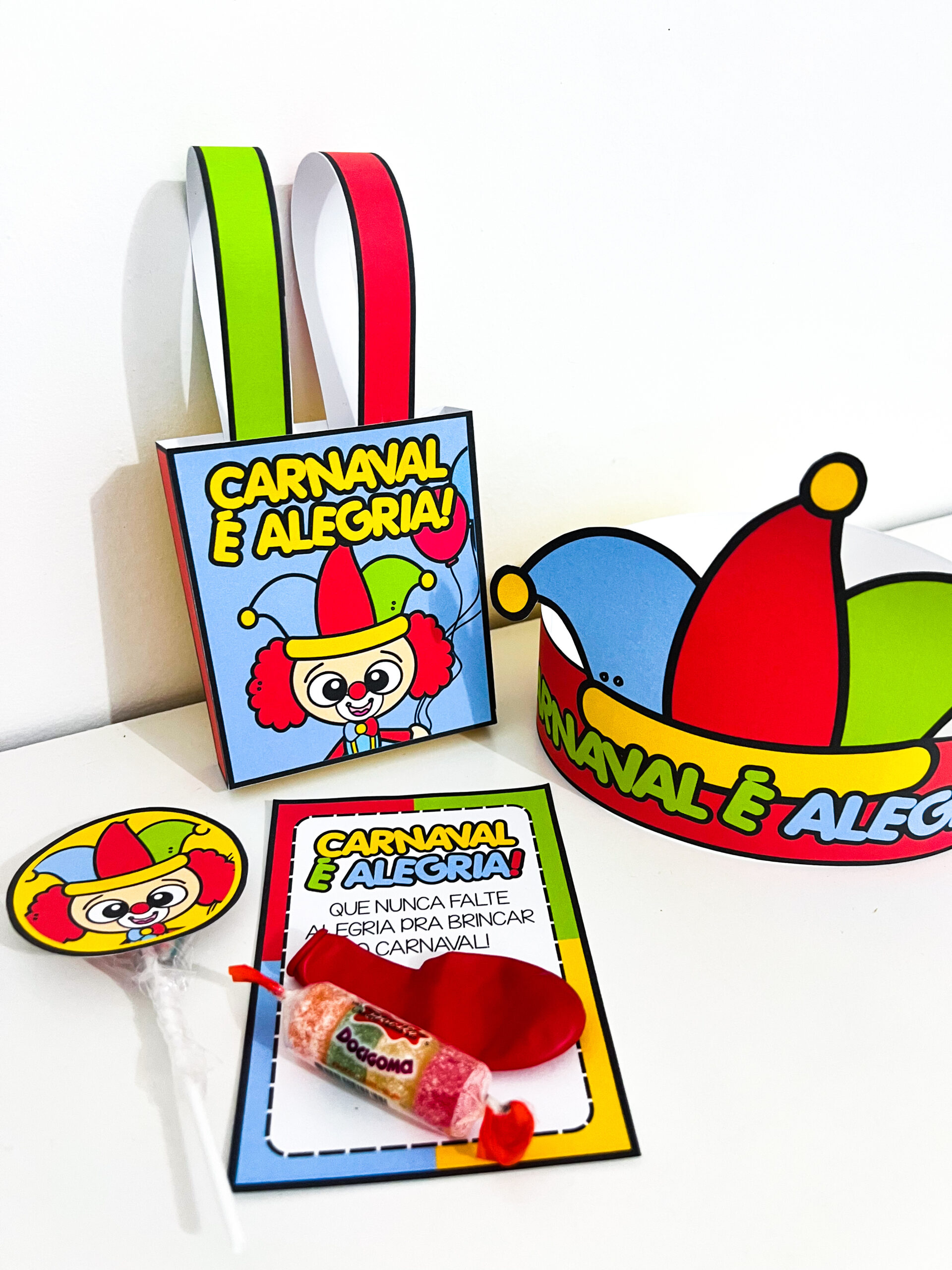 Ele conta com tag para pirulito, sacolinha de doces, cartão porta-doces e uma divertida coroa, ideais para encantar as crianças e entrar no clima carnavalesco.