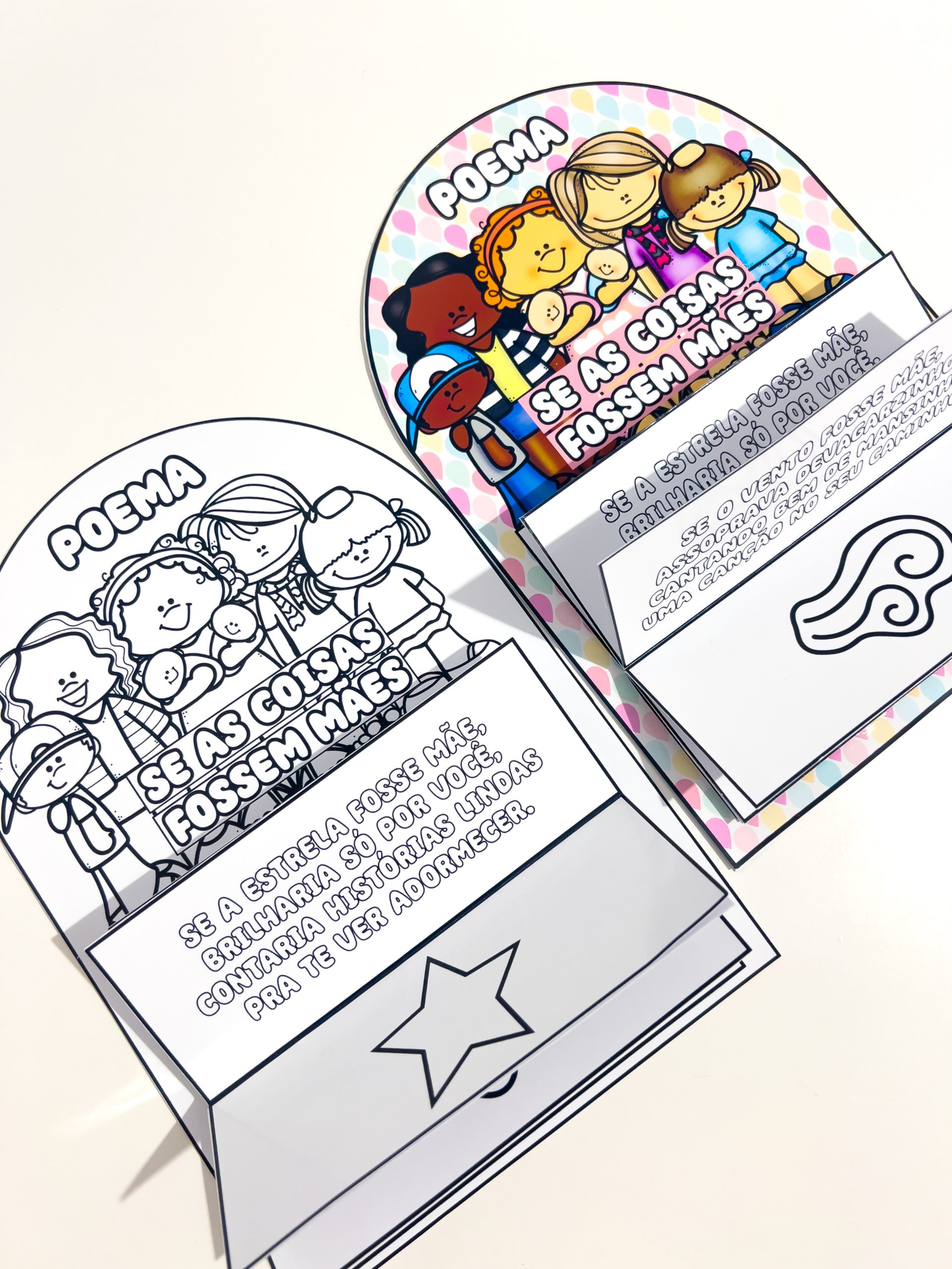 Luva Livro Se As Coisas fossem Mães O poema “Se as coisas fossem mães" tem um cunho afetivo, lúdico e poético, destacando o amor e o cuidado materno de forma simbólica. Ele imagina elementos da natureza (como nuvem, estrela, vento e rio) com características de mãe, exaltando o carinho, a proteção e a ternura que uma mãe oferece. A mensagem final valoriza a figura da mãe real como alguém insubstituível e cheia de amor. É um texto ideal para trabalhar o tema da maternidade de forma sensível com as crianças. Você pode usar esse material na opção luva ou apenas de livrinho, vai na versão colorida e para colorir, assim pode ser oferecida essa opção de atividade aos seus alunos.