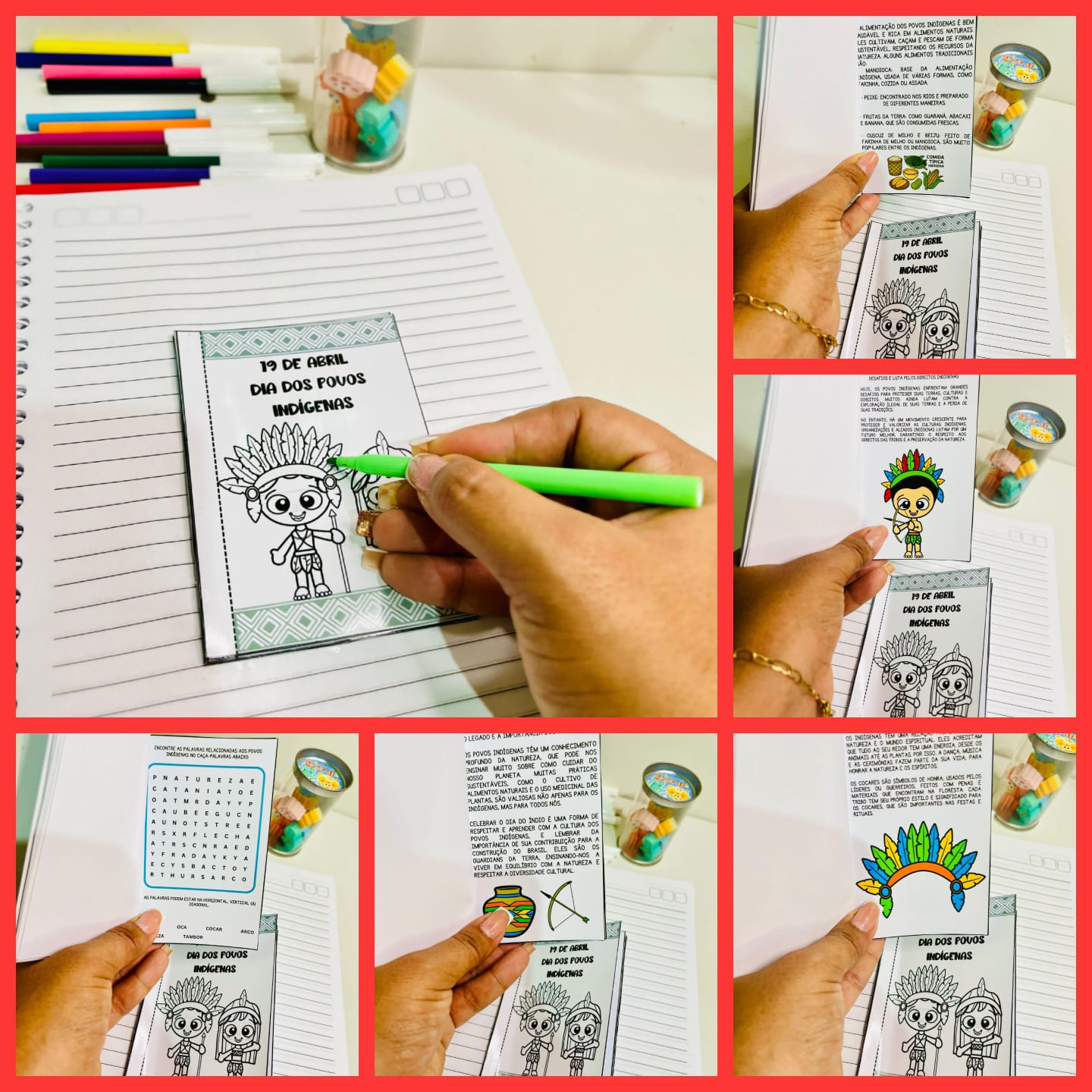 Esse mini Book apresenta atividades educativas, para colorir, como: 🏹 caça-palavras, 🏹 ilustrações para colorir com informações sobre a cultura, alimentos típicos e o modo de vida dos povos indígenas. Esses materiais são ideais para ensinar e celebrar a data com as crianças, destacando a importância do respeito à cultura indígena e a preservação de suas tradições. O conteúdo inclui tópicos sobre a alimentação tradicional, desafios pelos direitos indígenas, e as diferentes formas de habitação, como as malocas. Essas imagens podem ser utilizadas em atividades de conscientização e educação nas escolas, incentivando os alunos a aprender mais sobre os povos indígenas e sua cultura rica e diversificada.