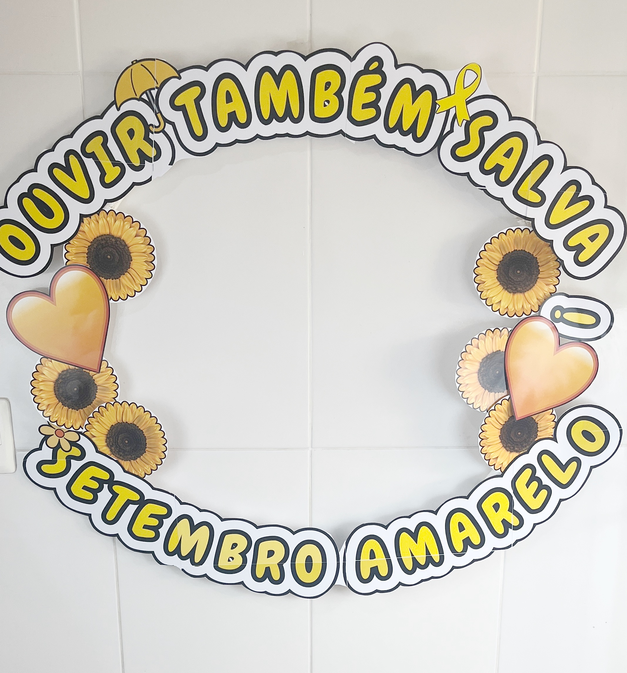 Nosso bambolê fotográfico traz a frase “Ouvir também salva” e é perfeito para registrar momentos de conscientização e valorização da vida.