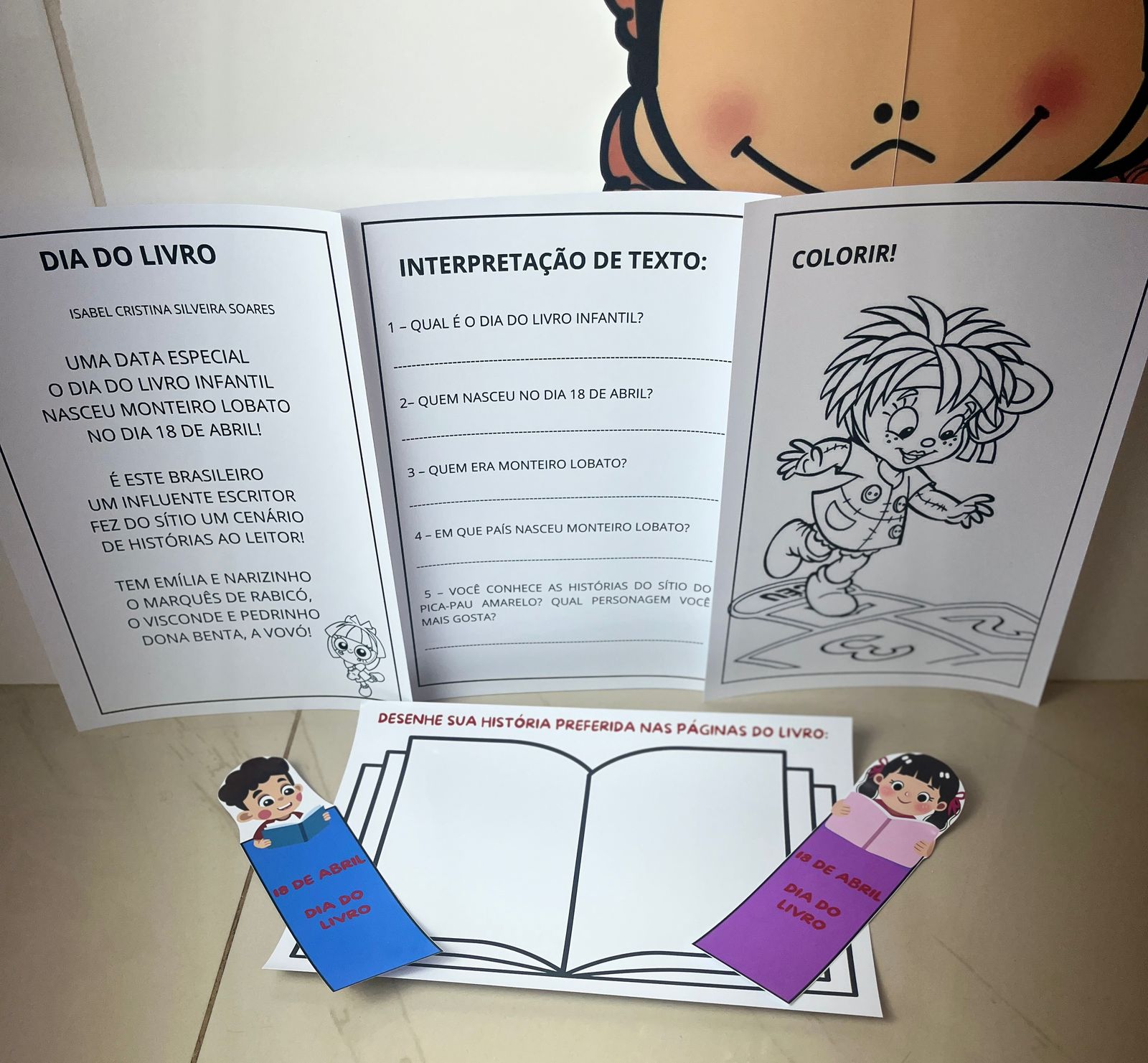 Painel lindíssimo, com o tamanho de 1,40m de largura por 1m de altura, ideal para decorar a sala de aula e trabalhar essa data tão especial com os alunos! O que acompanha o material: 📚 Painel com a frase: “Dia Nacional do Livro Infantil – 18 de abril” 👦👧 Menino e menina segurando livros ❤️ Livro com corações no centro ✏️ Atividade com poema e interpretação 🎨 Atividade para a criança desenhar seu livro preferido 🎁 Lembrancinhas: marcadores de página para colorir e presentear