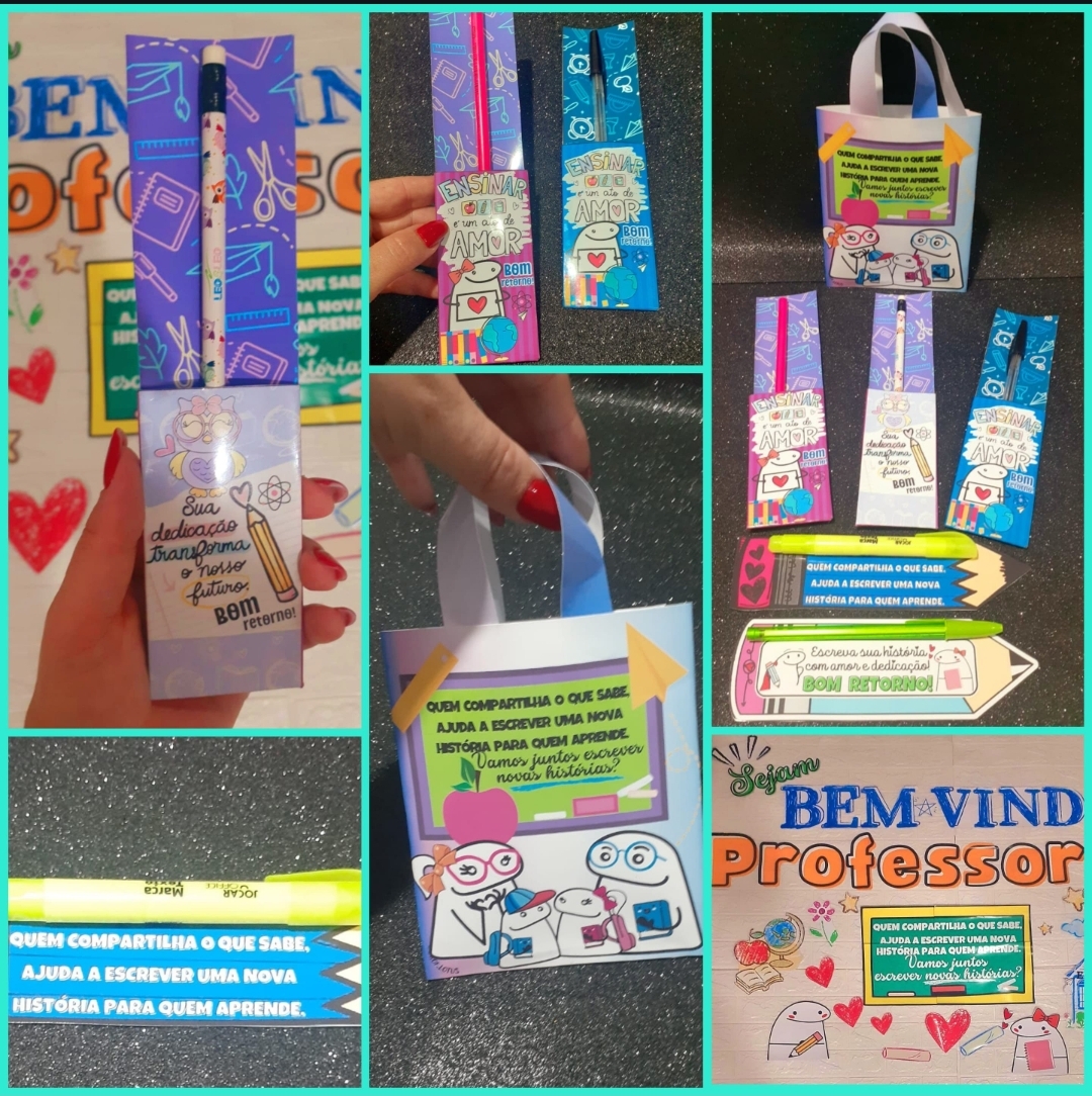 Lindo arquivo em PDF para recepcionar os professores. O arquivo contém; 📍Painel com imagens e palavras; 📍5 tags lembrancinhas porta lápis/caneta/marca-texto (Flork, sem imagem e de Coruijinha); 📍Sacolinha para lembrancinha. Tudo pronto para imprimir.