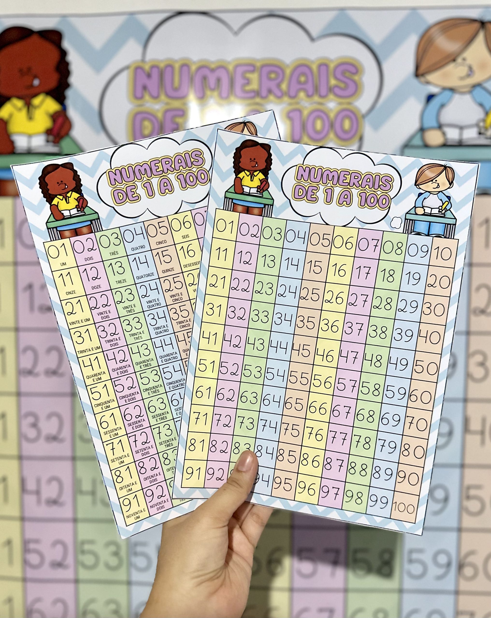 Painel numérico de 1 a 100, já ampliado, medindo 1m de altura e 0,7m de largura. A tabela vai em duas opções de impressão, tanto com os numerais e o escrito por extenso, e também a opção com os numerais apenas. O arquivo também acompanha as duas versões no tamanho A4.