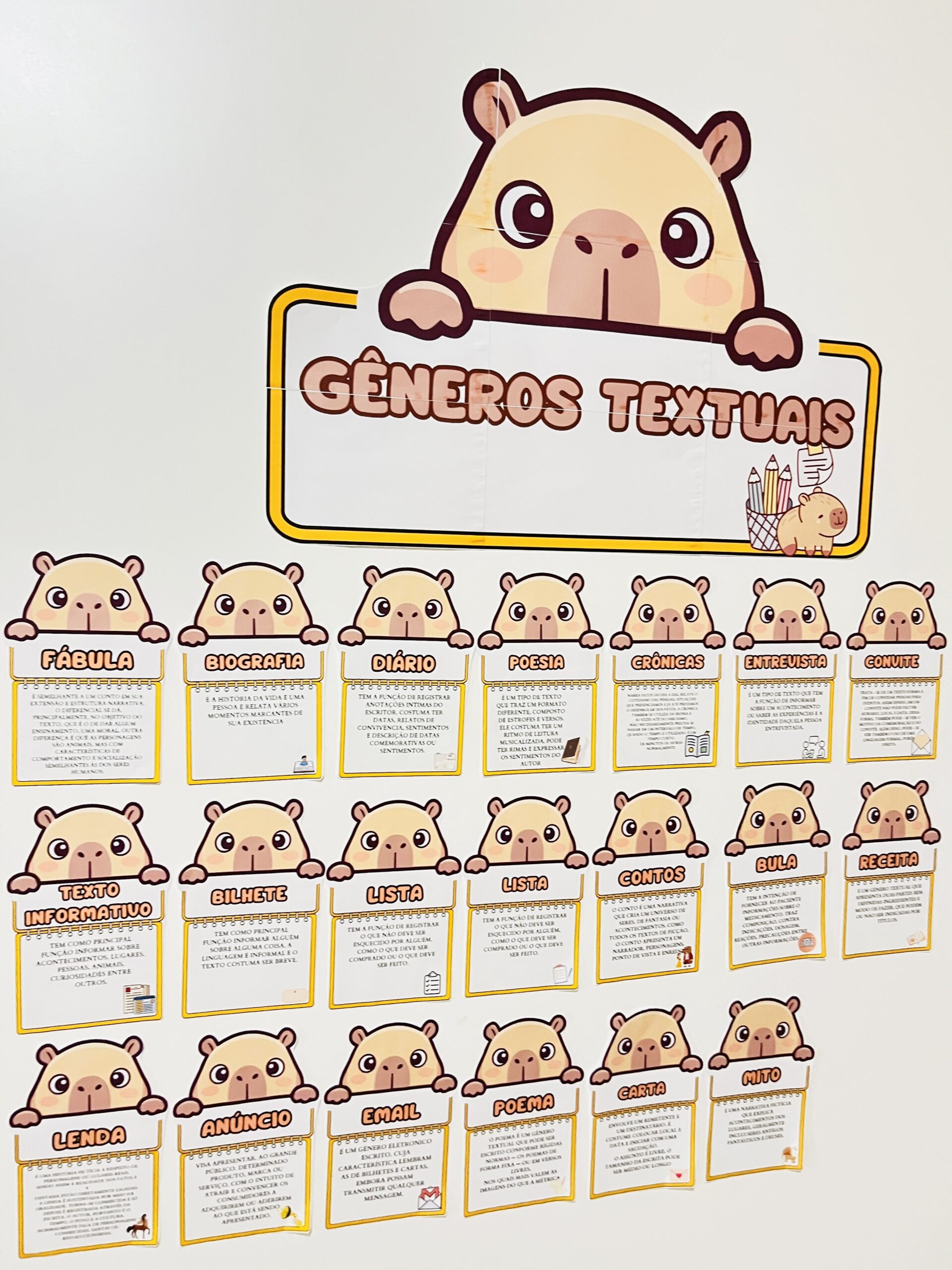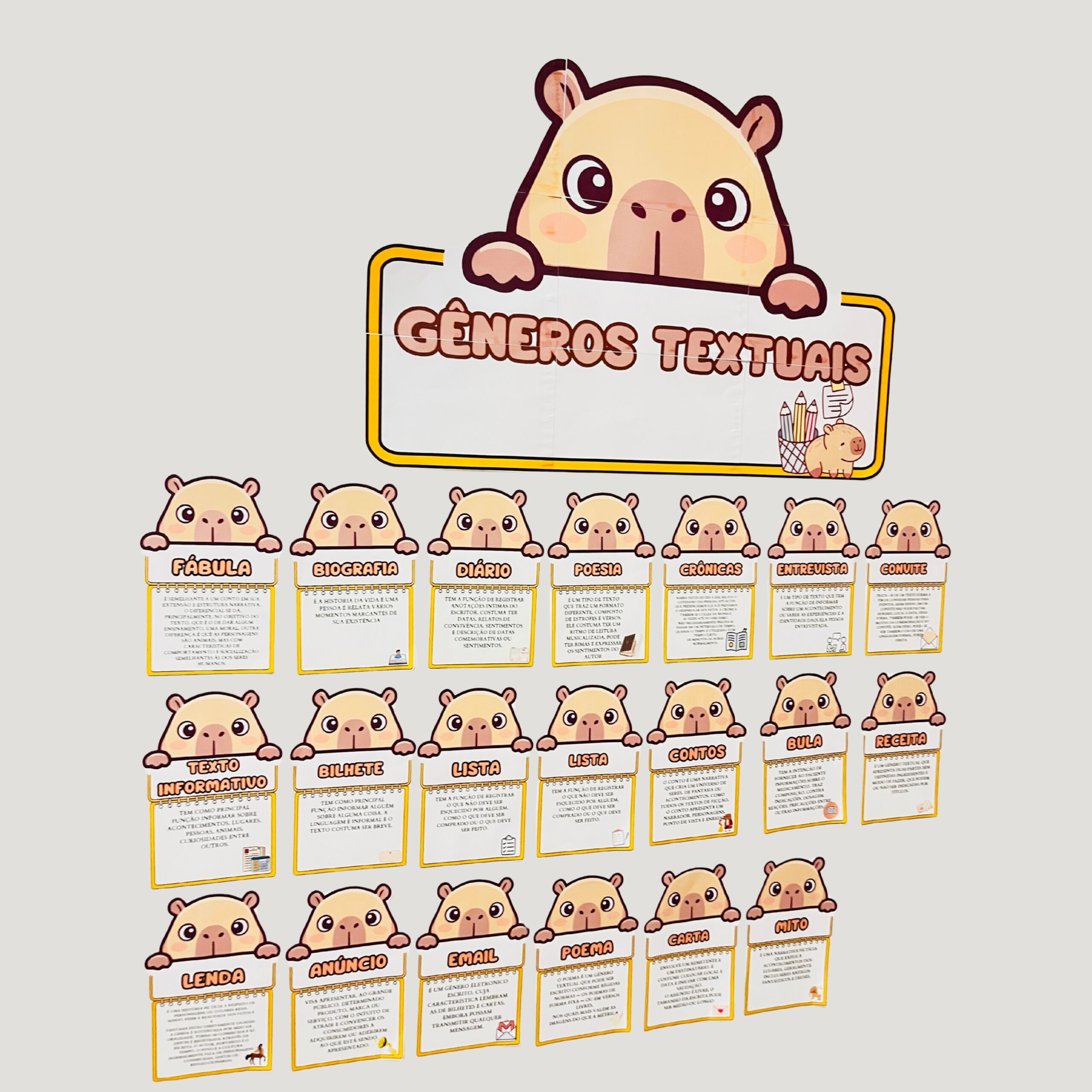 Apresento o Painel Completo de Gêneros Textuais – Tema Capivaras, um recurso lúdico, colorido e super atrativo que vai encantar seus alunos e facilitar a aprendizagem de forma leve e divertida!