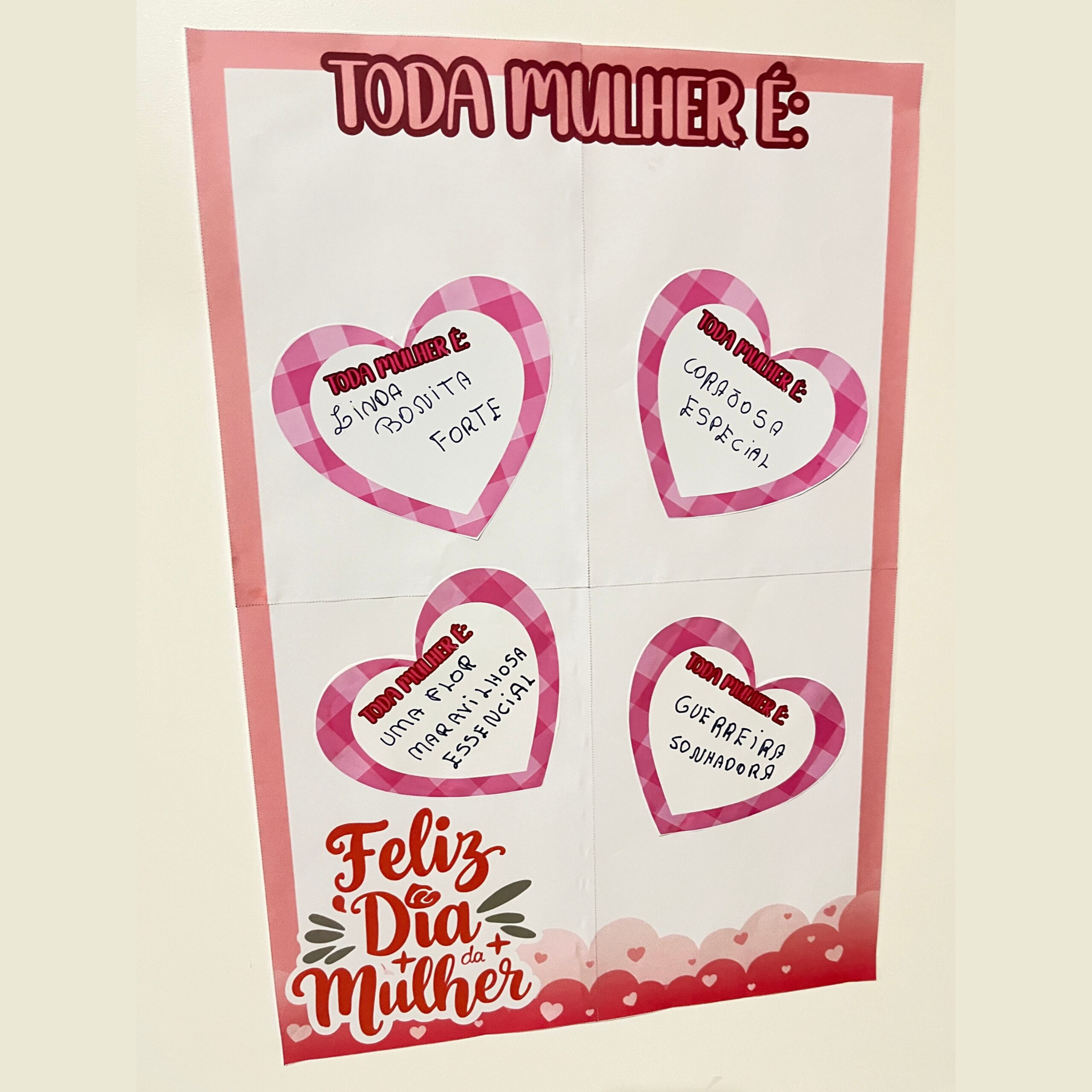 Com o painel “Toda Mulher É…”, cada criança escreve um elogio ou qualidade para completar a frase e cola sua mensagem no mural, construindo juntos um lindo painel coletivo de reconhecimento e carinho.