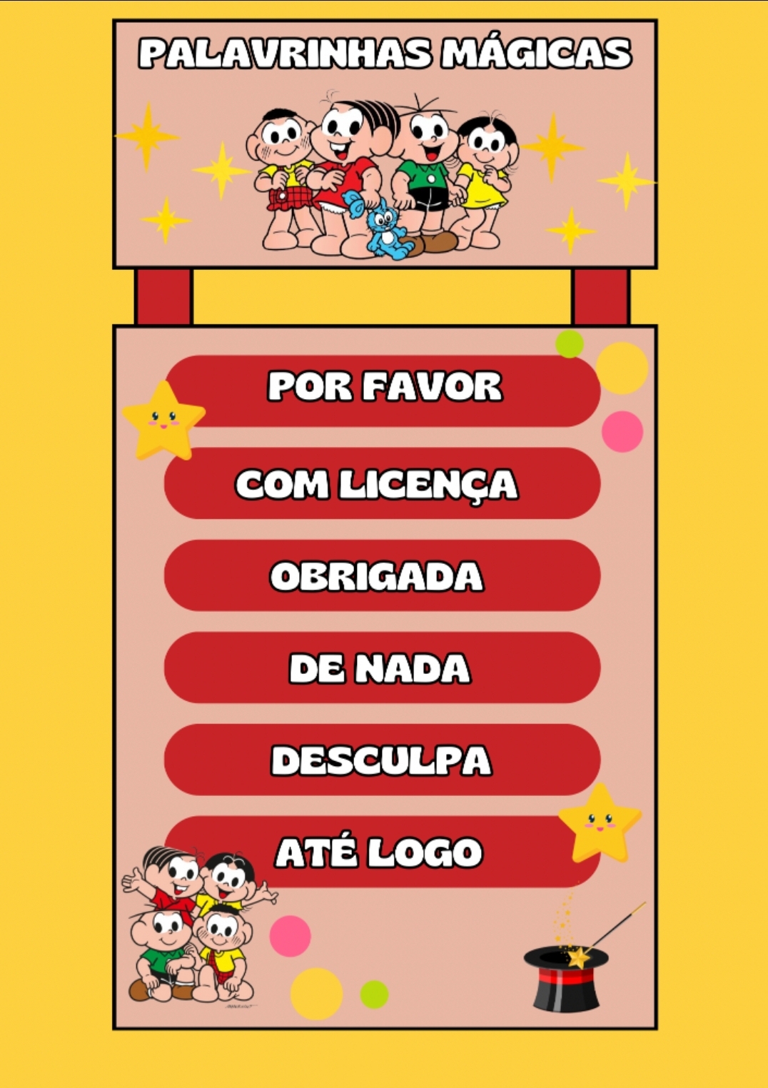 🌟 Transforme o comportamento da sua turma de forma lúdica e encantadora! Com este arquivo pedagógico, você incentiva boas práticas, valores e educação emocional enquanto diverte seus alunos com os personagens mais amados do Brasil. 📂 O que você recebe? ✔️ Arquivo ampliado - tamanho de 4 folhas A4 juntas. ✔️ Design colorido; ✔️ Arquivo no tamanho de 1 folha A4 . 💡 Perfeito para criar uma sala de aula harmoniosa e motivadora! ✨ Leve magia para o aprendizado!