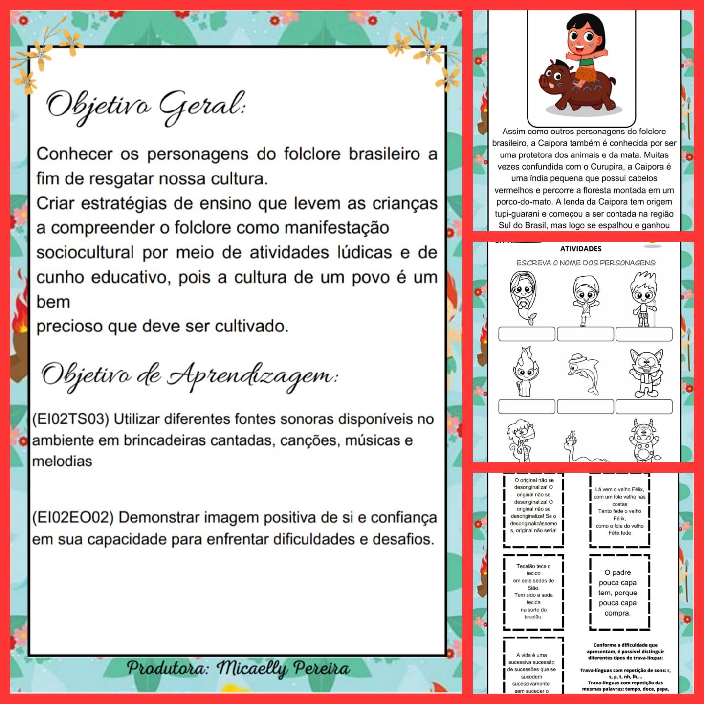 O objetivo do PROJETO FOLCLORE BRASILEIRO é apresentar os personagens do folclore brasileiroas crianças, a fim de resgatar nossa cultura através de estratégias de ensino que levem as crianças a compreender o folclore como manifestação sociocultural por meio de atividades lúdicas e de cunho educativo, pois a cultura de um povo é um bem precioso que deve ser cultivado. O projeto contém: ✅ Justificativa ✅ Objetivos de atividades (bncc) ✅ Características dos personagens ✅ Atividades ✅ Cards personagem ✅ Jogos ✅ trava línguas ✅ 49 páginas Obs: arquivo colorido em pdf, não editável! Clique aqui⤵ CONHEÇA NOSSOS PROJETOS