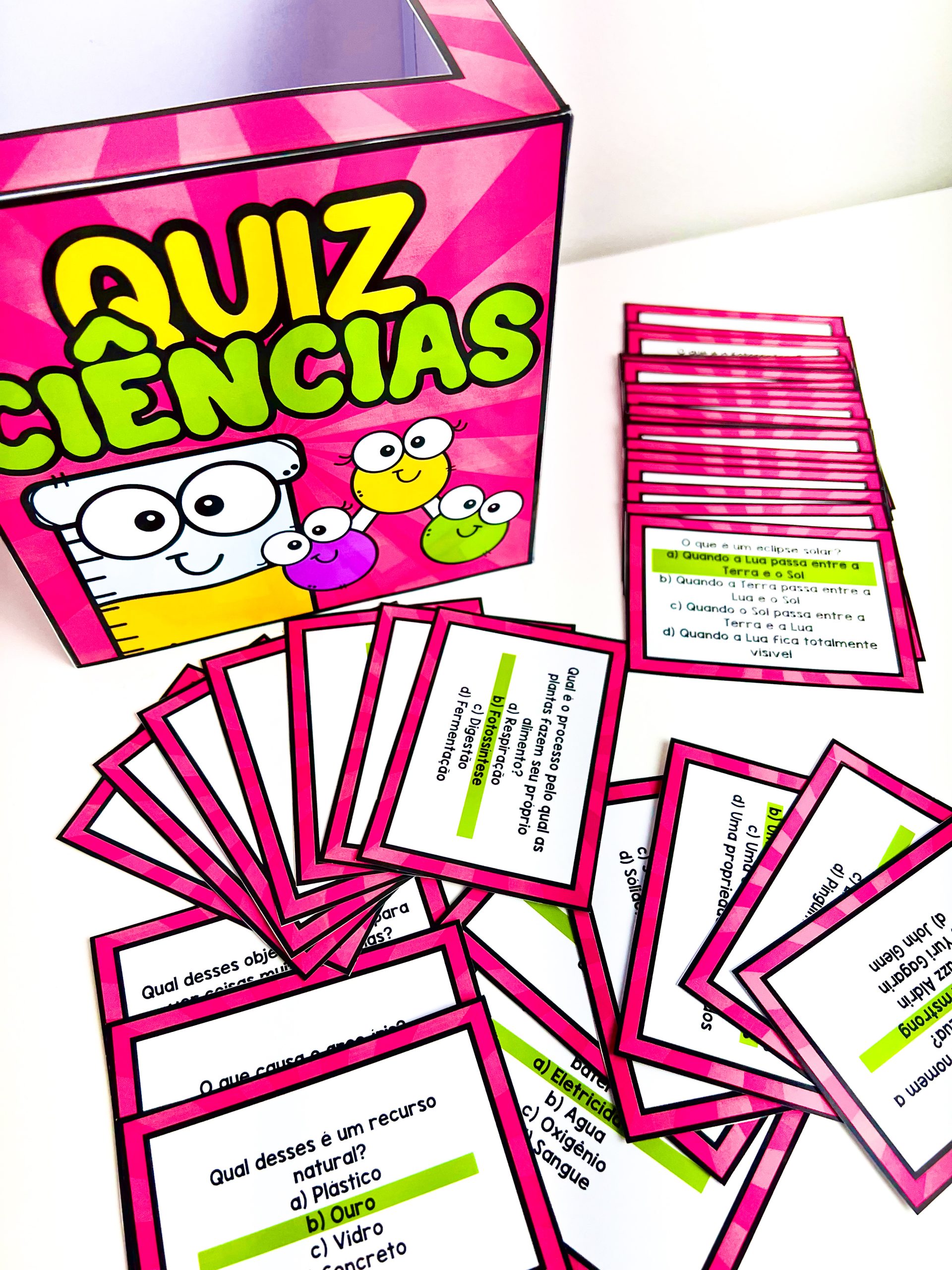 O Quiz incentiva o pensamento crítico e a resolução de problemas, habilidades importantes no estudo de ciências. Esta dinâmica contém: - 36 fichas de perguntas da disciplina de ciências. Cada ficha contém 4 opções de respostas para a criança escolher. - Um manual de instruções para auxiliar os alunos e o professor na dinâmica. - Uma caixa para armazenar as fichas de perguntas. - Perguntas sobre tempo, plantas, animais, estados físicos, corpo humano e entre outros.