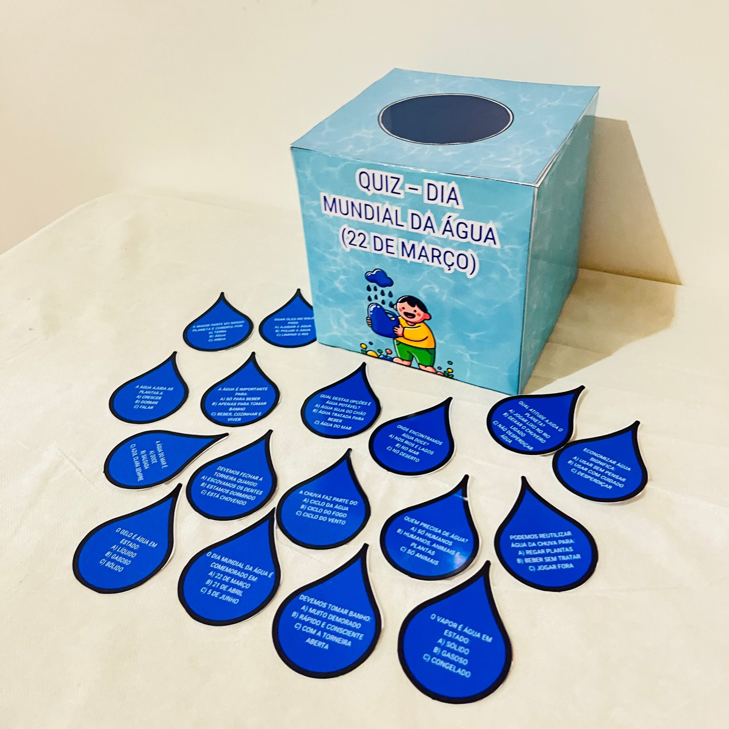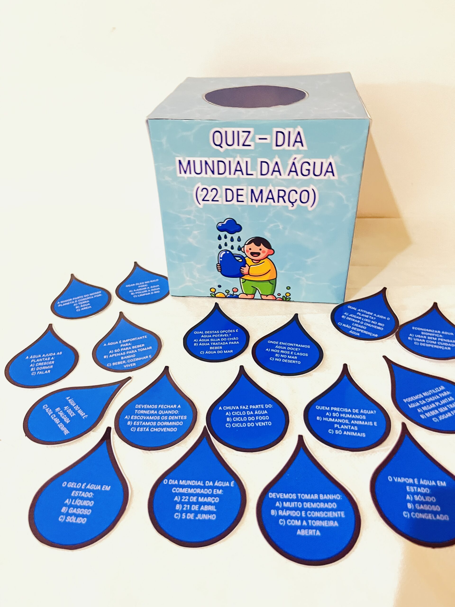 O Quiz Dia da Água foi pensado para envolver os alunos com perguntas simples, curiosidades e desafios que estimulam o raciocínio e a reflexão sobre a importância da água no nosso dia a dia.