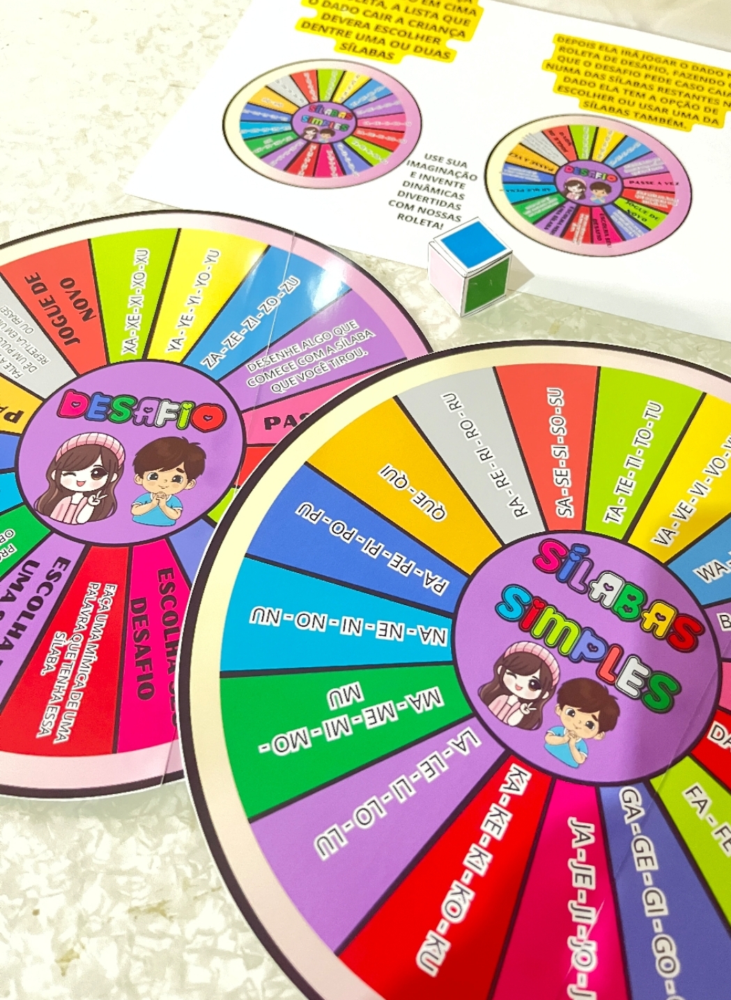 Que tal transformar o aprendizado das sílabas em um jogo interativo e envolvente? ➡️Apresentamos a Roleta das Sílabas, um material lúdico que estimula a leitura e a escrita de forma natural e divertida! 🔠 COMO FUNCIONA? ✔️ Jogue o dado e escolha uma sílaba. 🎭 Em seguida, role o dado novamente para descobrir seu desafio! 🎨 Desenhe, fale palavras, crie rimas, faça mímicas e muito mais! 💡 POR QUE A ROLETA DAS SÍLABAS É IMPERDÍVEL? ✅ Torna o aprendizado dinâmico e prazeroso. ✅ Estimula a criatividade e o raciocínio rápido. ✅ Ideal para reforço escolar e atividades em grupo!