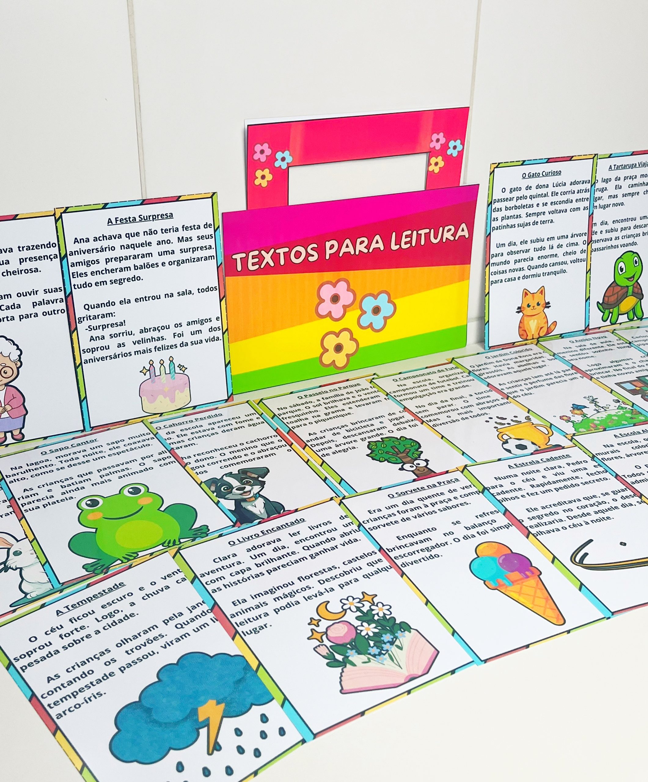São 18 textos exclusivos, escritos em letra minúscula, ideais para alunos em processo de alfabetização.