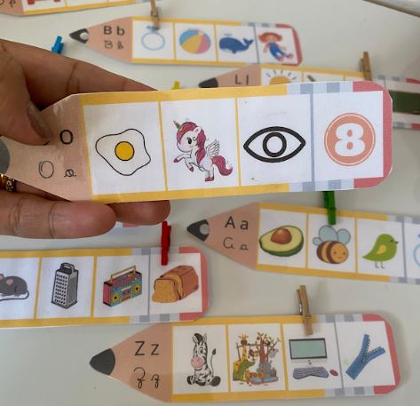 🔉25 cartelas de A – Z a criança deverá marcar qual a imagem não inicia com a letra indicada na ficha;