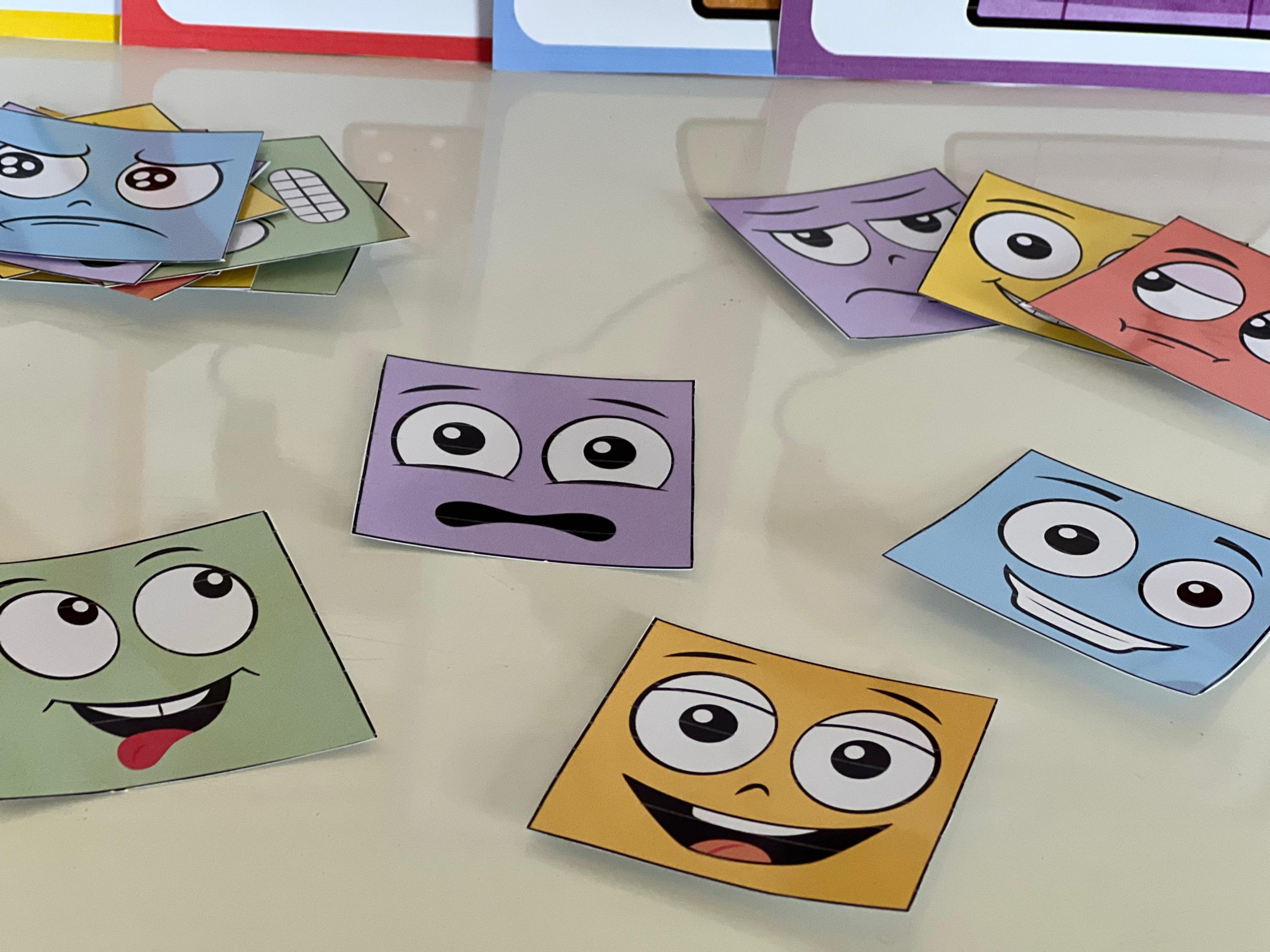 São 11 tabuleiros com rostos para as crianças incluir as emoções e entender as emoções escolhidas.